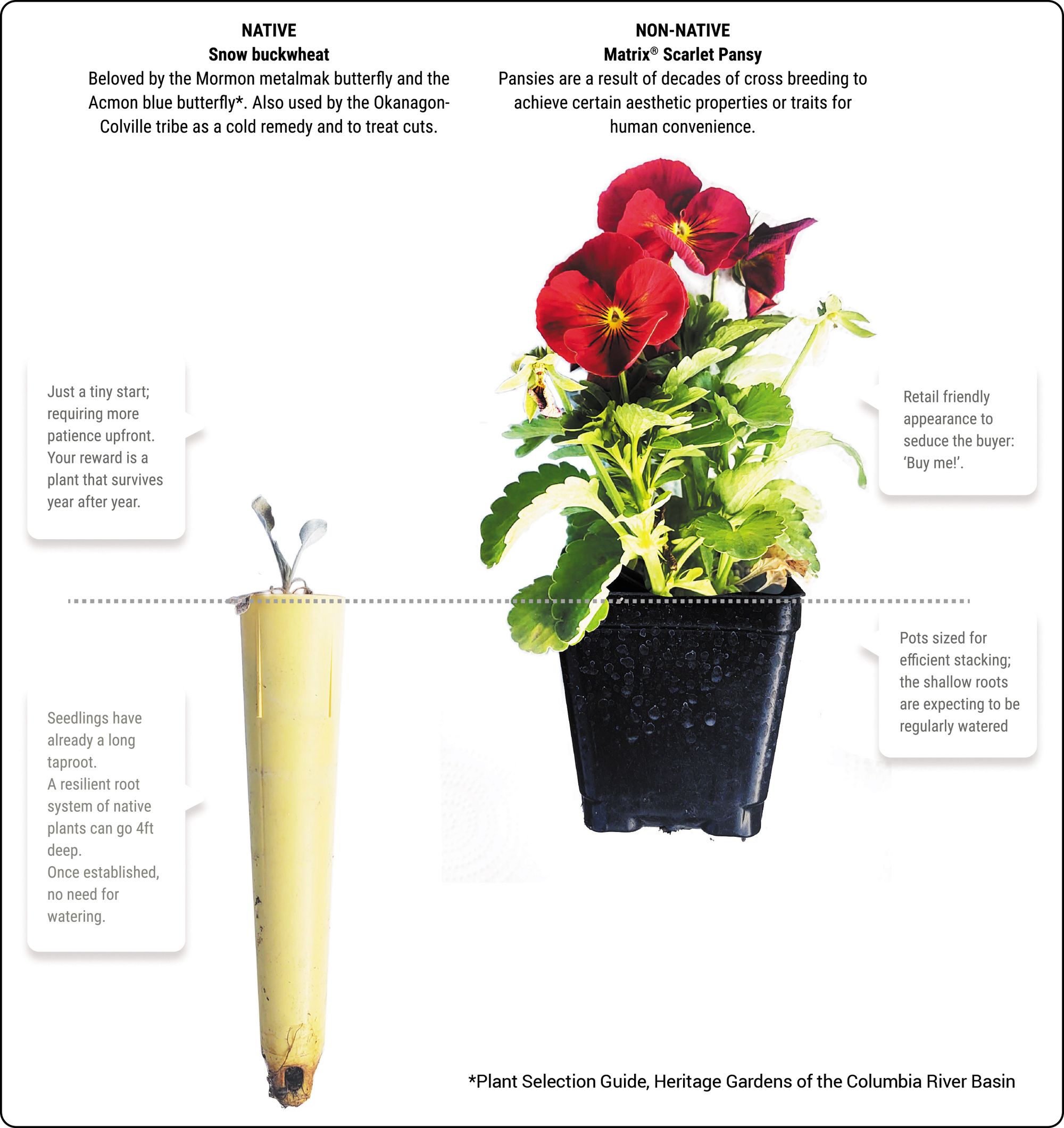 The visual below shows the contrast: a native plant versus a conventional one at the time of purchase.