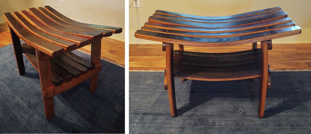 He started various projects using barrel wood and said he ended up with his current designs through trial and error. The characteristic curve in the wood creates a guaranteed comfortable seat. “This curve fits you, no matter what,” he said.