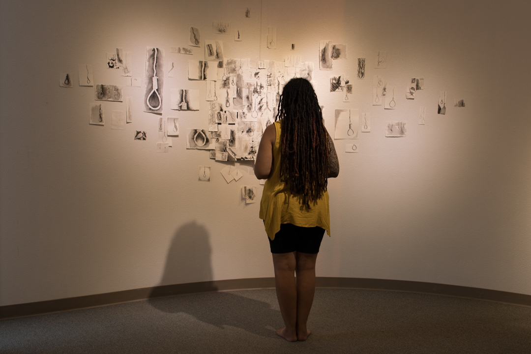 Above: Felicia Follum ponders her 2020 exhibition “Make it Plain” which examines Black history and the process of lament from a Biblical perspective. The large work in the background is titled 1892 and is composed of 230 nooses representing the lynchings in that year.