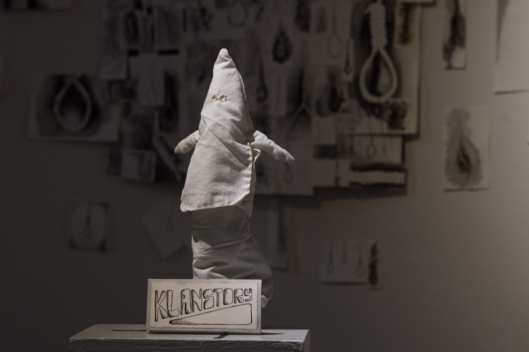 Below: A brief history of the KKK in the U.S. and a flip doll responding to her own family history. Her biological father owned a chain of 5 BBQ restaurants including one on the main street in Athens, GA. He made the wrong people angry and was assassinated in 1996 when closing his restaurant. The Flip doll turns over into a man with a BBQ apron.