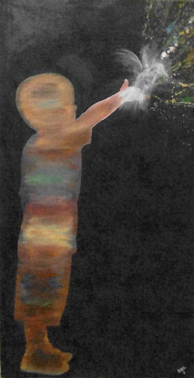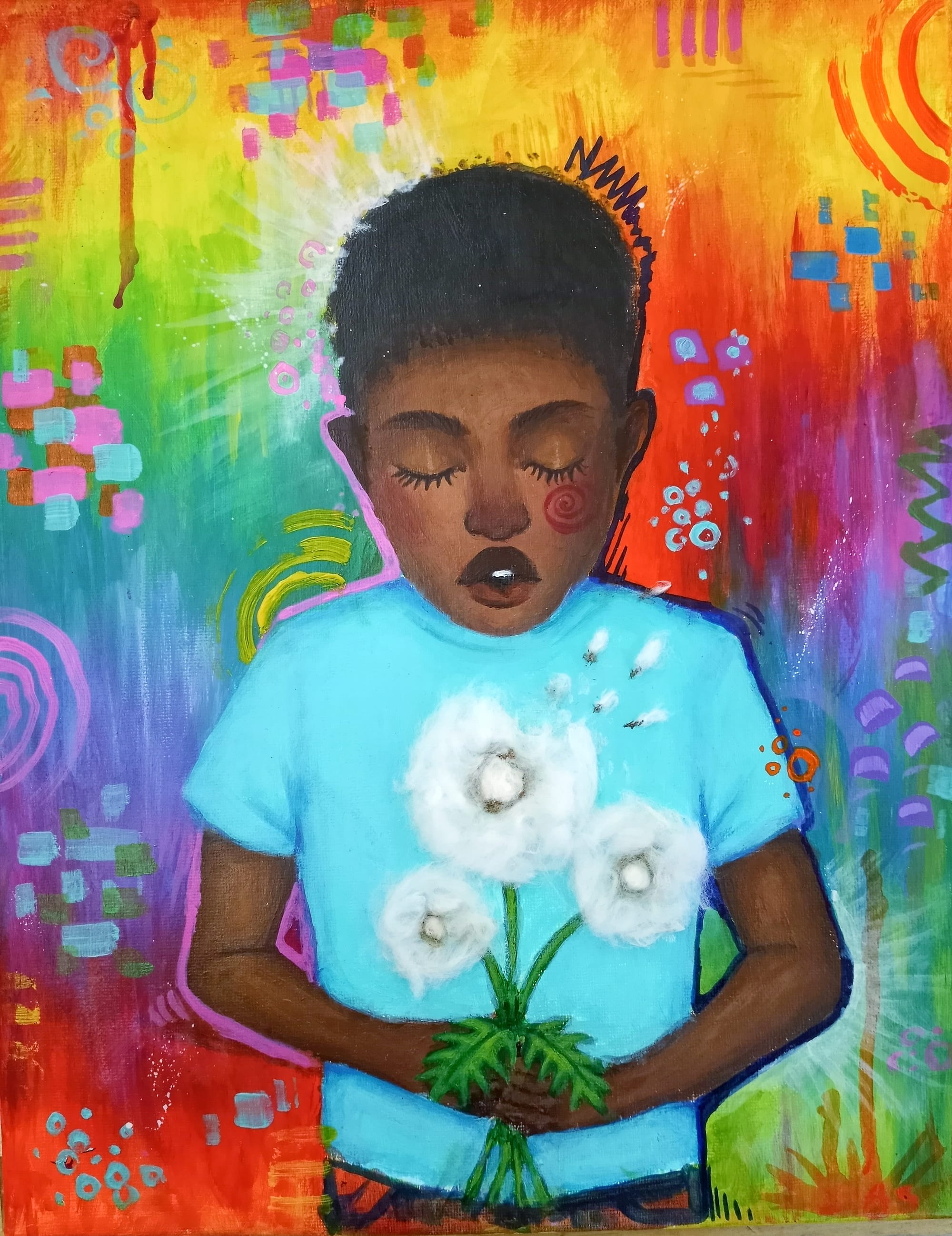 A while ago, I stumbled across a picture I took of my kid brother blowing away the seeds of a white fluffy dandelion. On a walk, he saw a bunch and ran to pluck one. “I WISH —” he started excitedly before I could stop him from saying his wish out loud. He was so earnest and innocent that I just had to take a picture. The photo reminded me of the childlike wonder I once had and how it inspired me to start painting. And in hopes of coming back to that, I render the photo that made me remember.