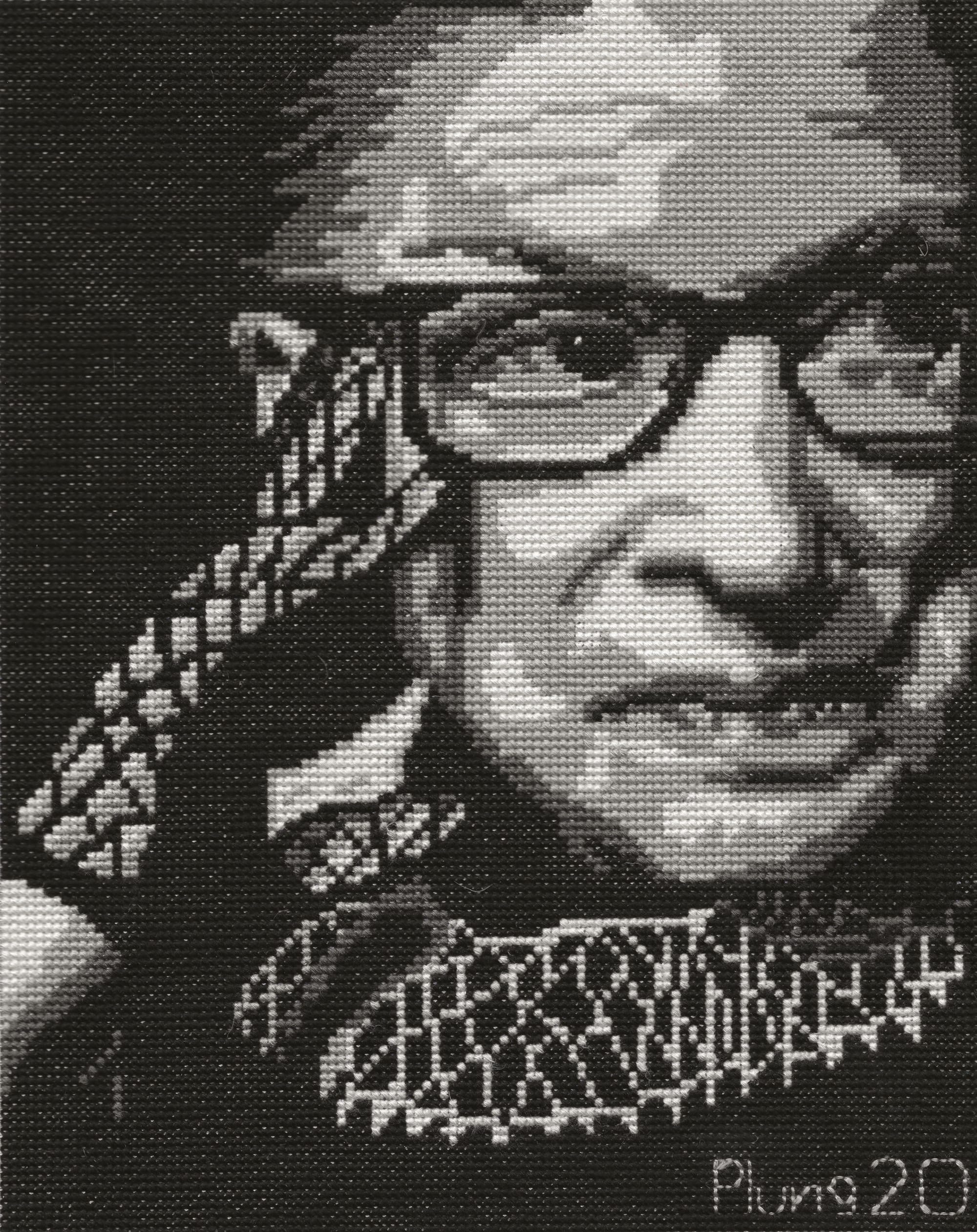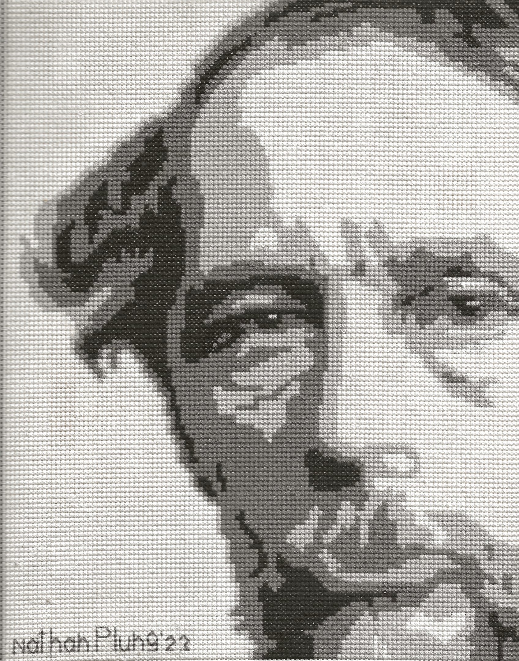 LEFT TO RIGHT: Charles Dickens (2022), Ruth Bader Ginsburg (2020), Samuel Beckett (2017) / Cross-stitch by Nathan Plung