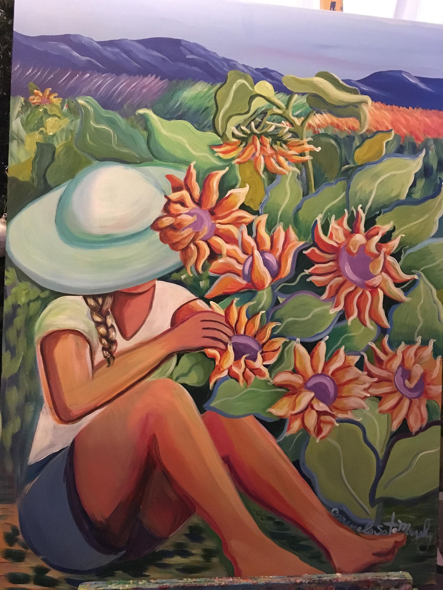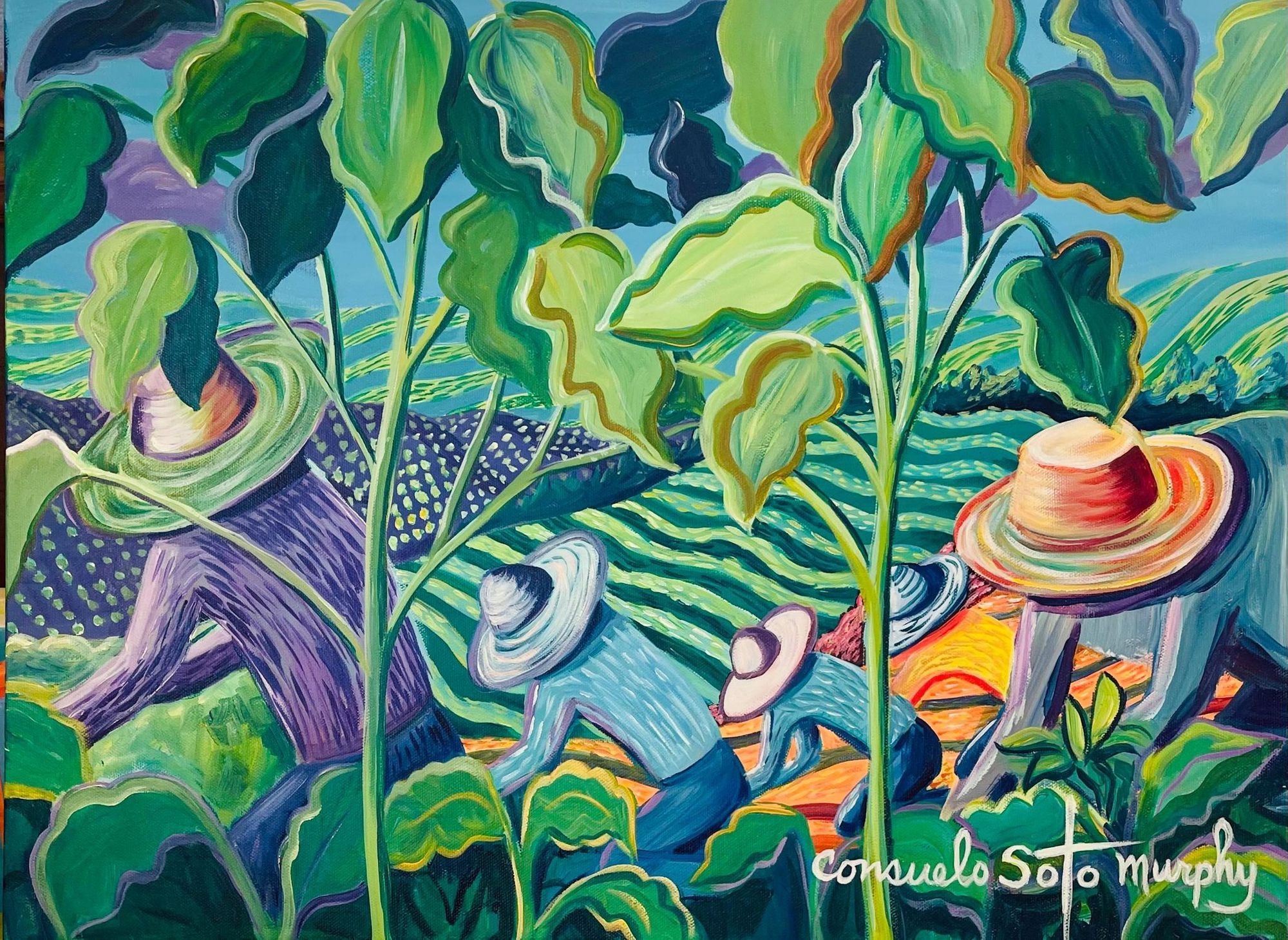 “I’m inspired by my family who were migrant workers. We worked in agriculture and loved looking at the beautiful green and fruitful landscapes. I paint what I remember. It was hard work, but I loved working with my family. I paint in an expressive and colorful abstract style.”