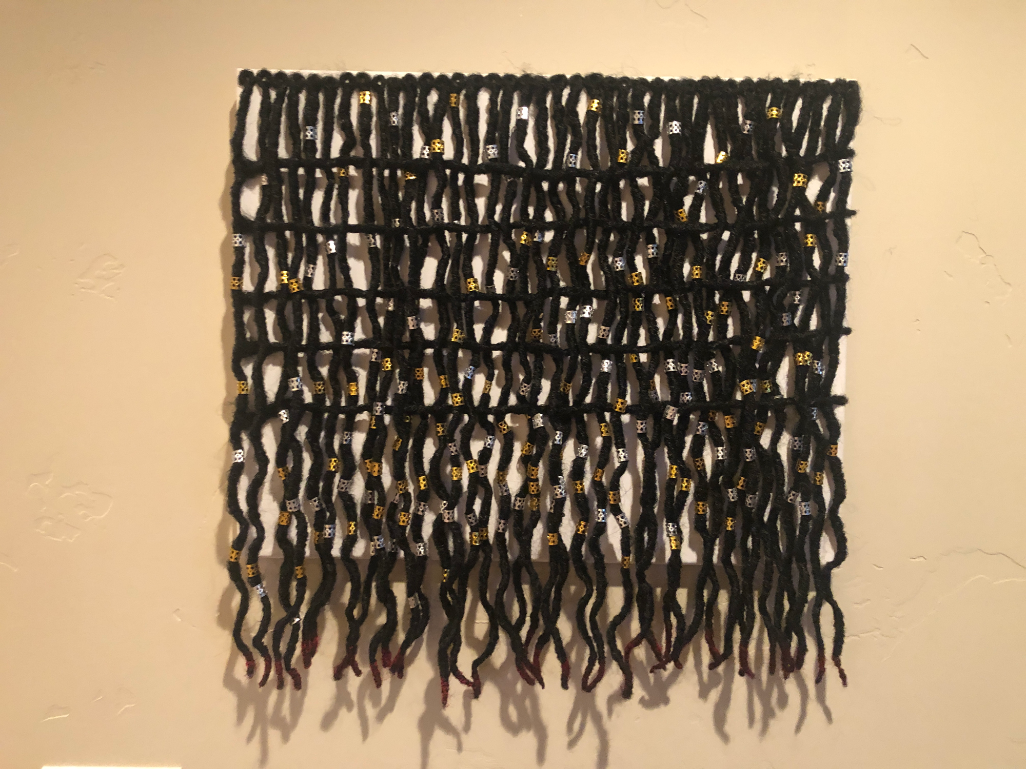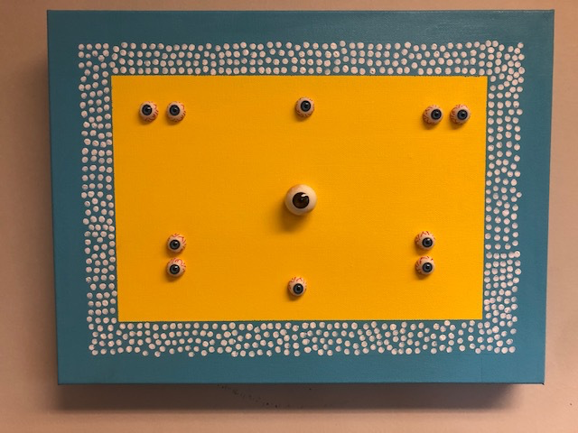 Generally, I work with canvas and acrylic paint. Some of my recent projects have included Styrofoam balls, faux hair, and bullets.