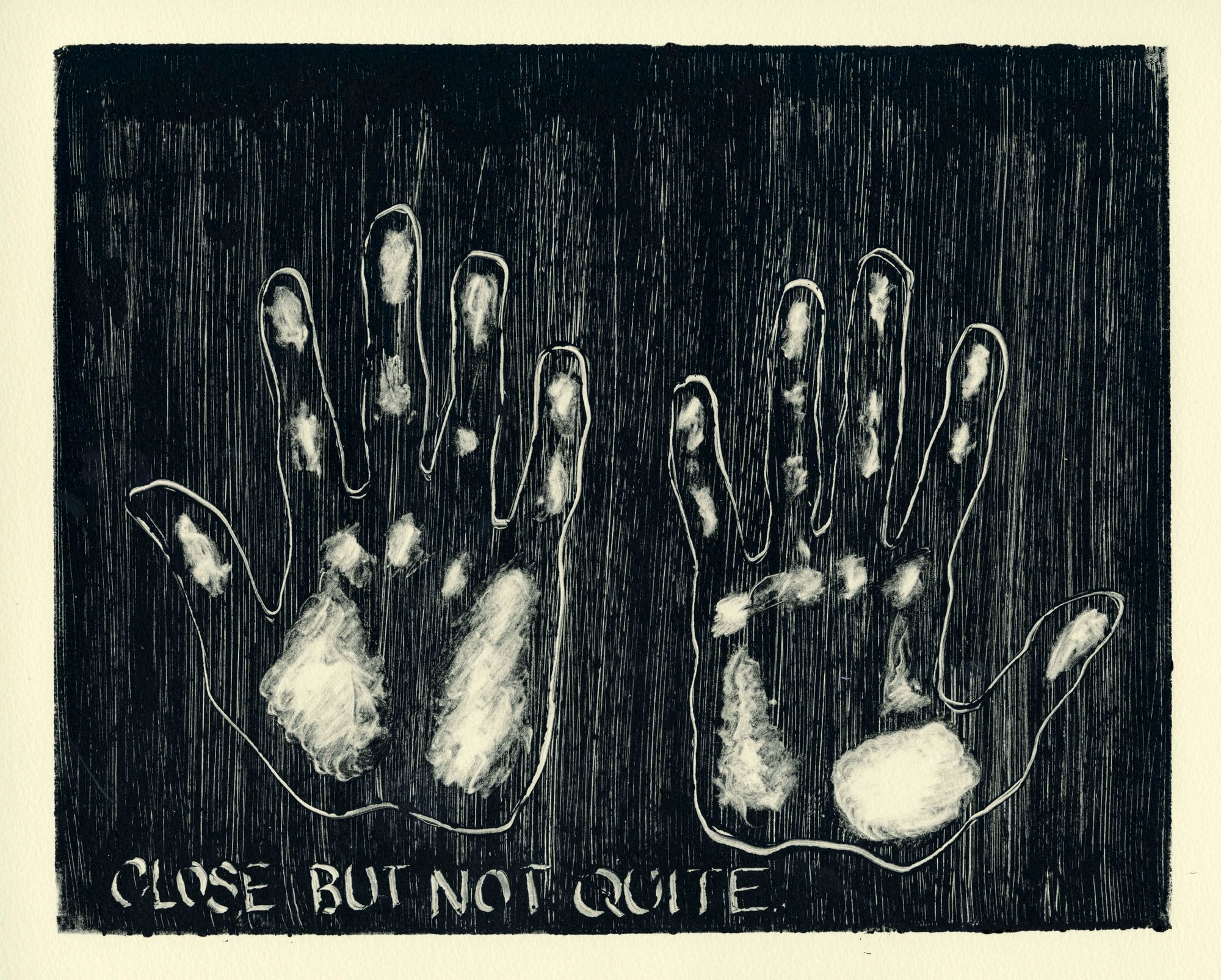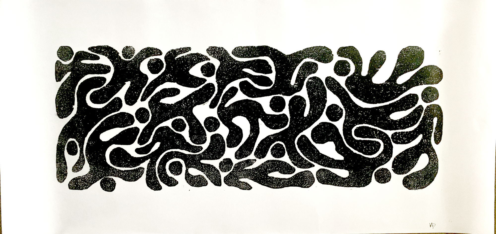 Yes, the woodblock print ‘Confinement’ is a playful experiment of the relationship between fluid shapes in a confined space. It was created with the question of what it means to be an individual in a community, capitalistic society, and even within the structures of our bodies. The print itself resembles this strict, invisible barrier fulfilled by vessels that are mixing and melding into the space, while the woodblock is a literal representation of the hard, constricting boundaries that we try to remain flexible and soft within. Ultimately my goal for the piece (and my personal development) was to create something seemingly smooth out of such rigid material.