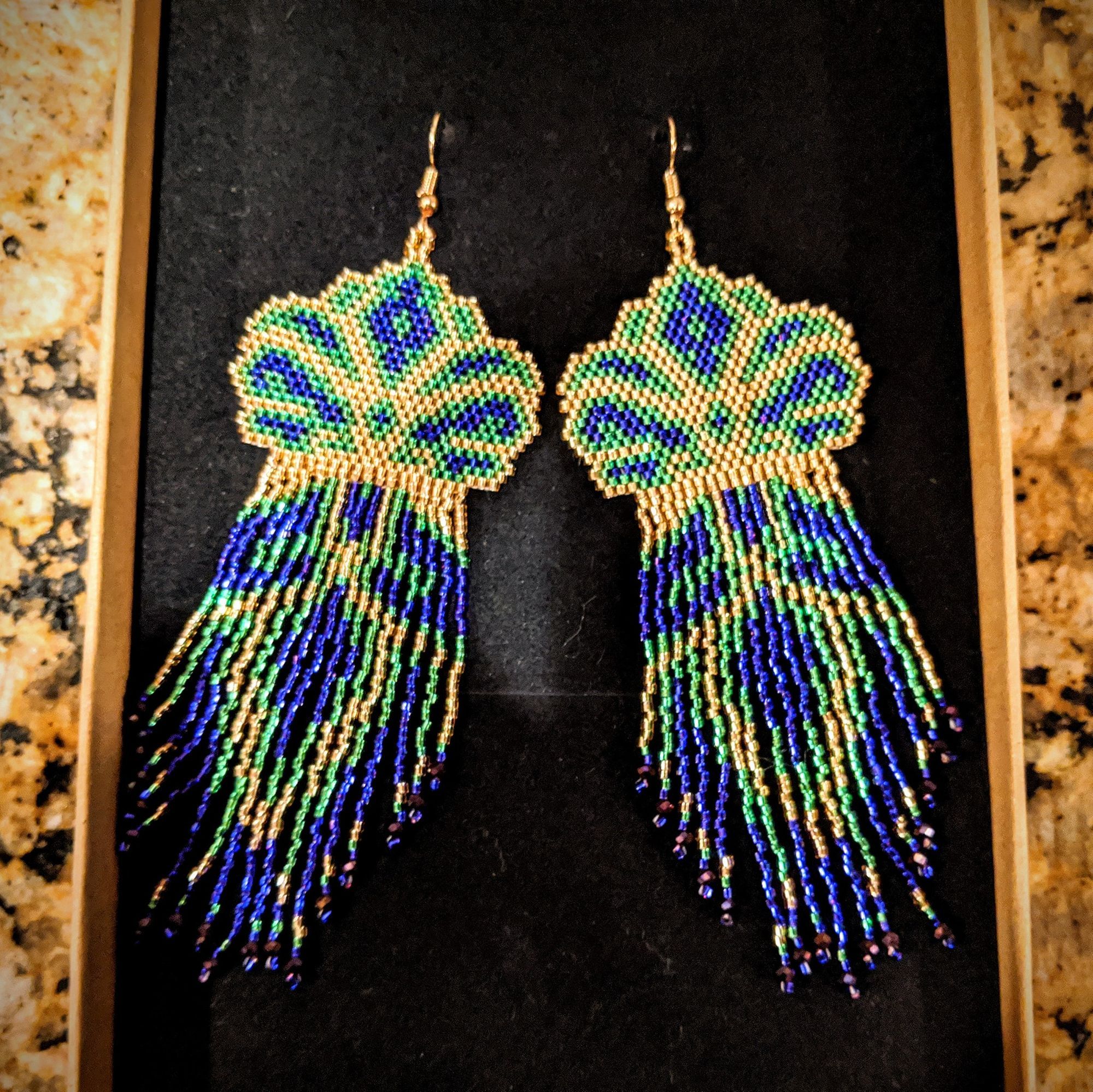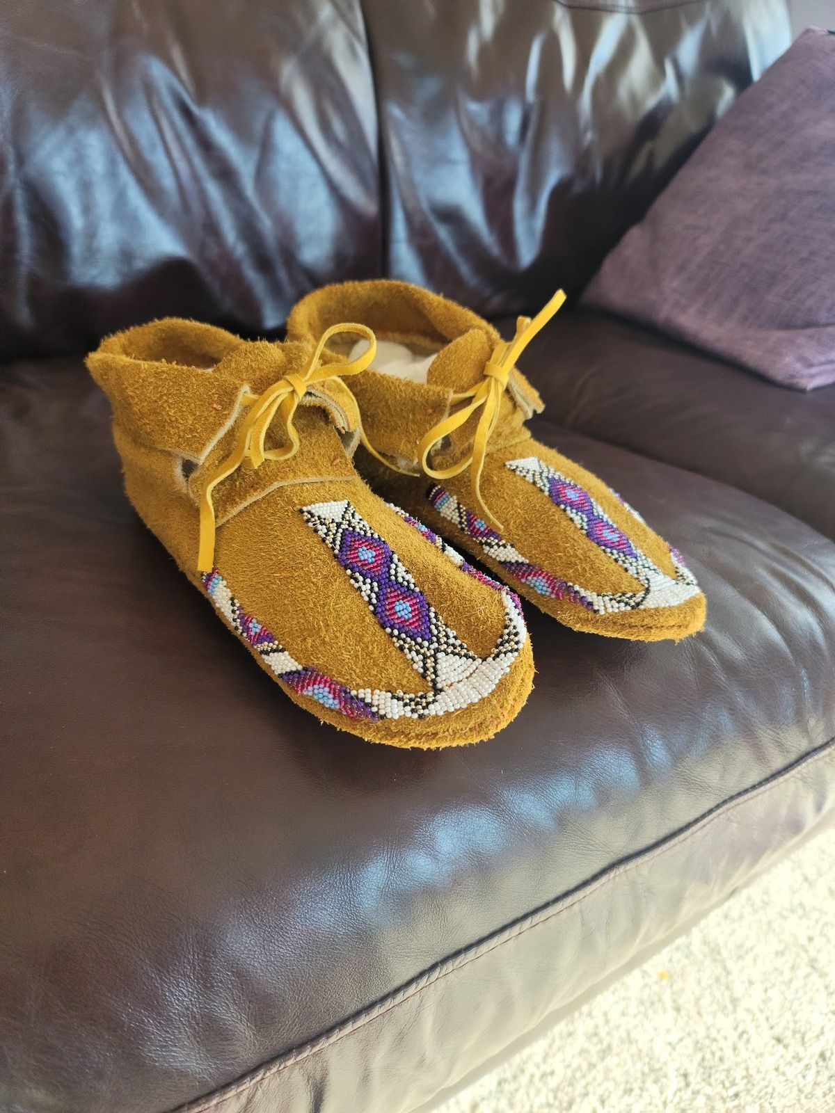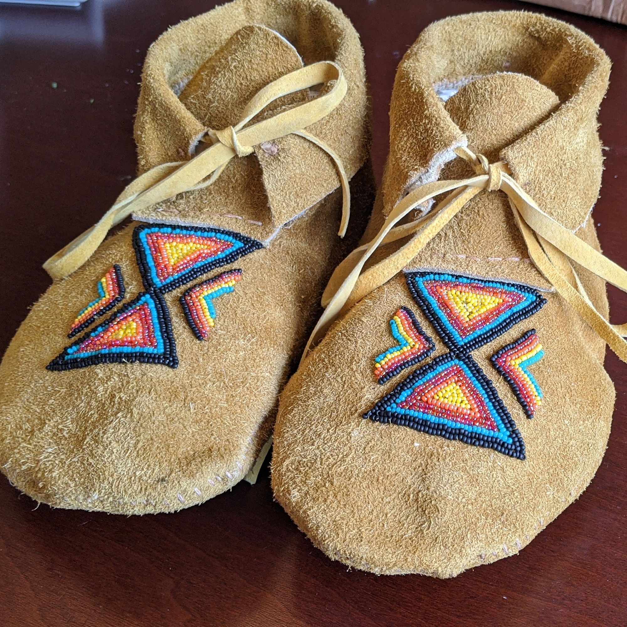 I've primarily made earrings using brick stitch, a beadweaving technique, but I've spend the last few months working on my skills with bead embroidery, which is entirely different even though the same materials are used. My current project is a beaded medallion to put on a mask, and I just finished a pair of beaded moccasins.