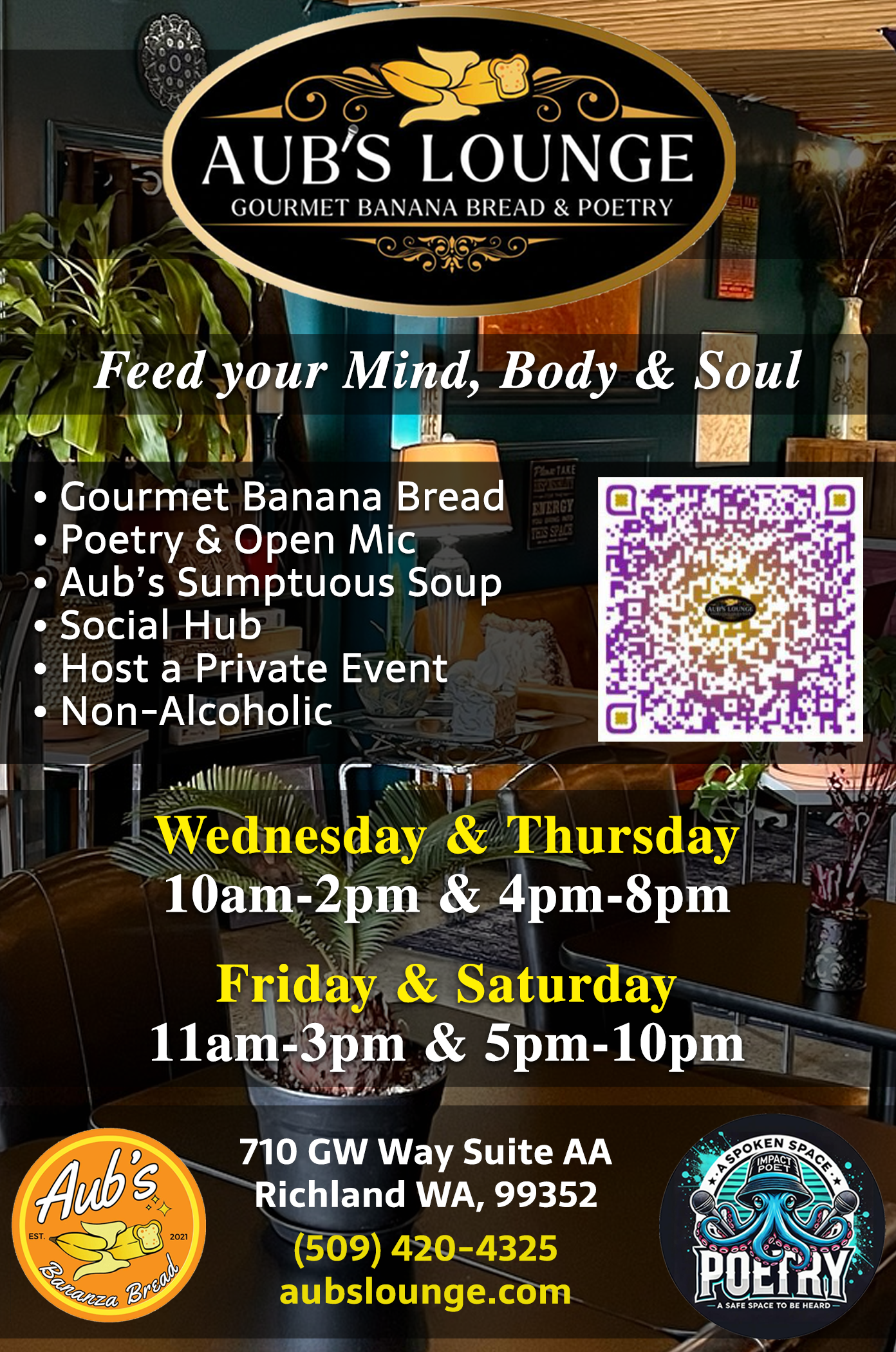 Located off George Washington Way in Richland, Aub’s Lounge: Gourmet Banana Bread & Poetry isn’t just a bakery, it’s a sanctuary for community and creativity. Founded by Aubrieann Johnson — a Black, queer entrepreneur — Aub’s Lounge offers an alcohol-free environment that promotes genuine human connection. What started in 2021 as Aub’s Bananza Bread has grown into a social hub brimming with culture and comfort.