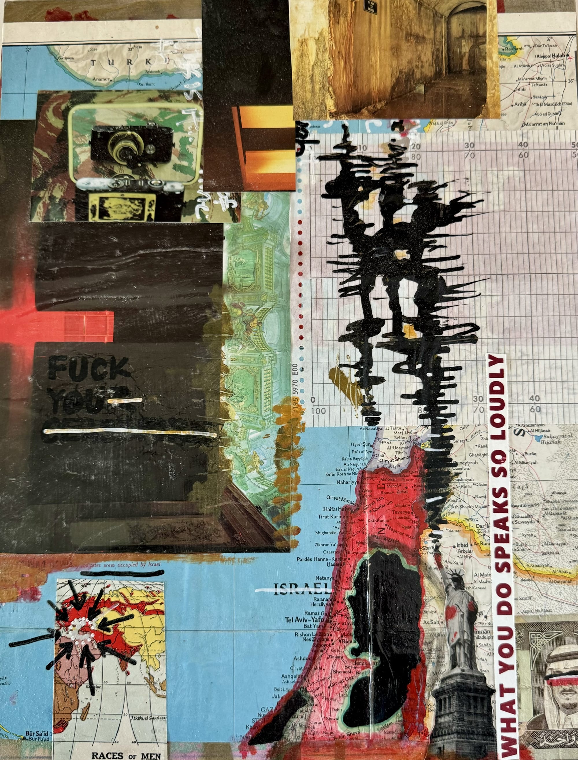 (Clockwise from top left): Postcard from 2024 Gaza/Deidre Holmberg; Purple Reign/Troy Thompson; Reflections of Autumn's Glow/Laura Gable; White Cup, Blue Chair/Shea White; Traversing Time and the Universe/Viki Quinn