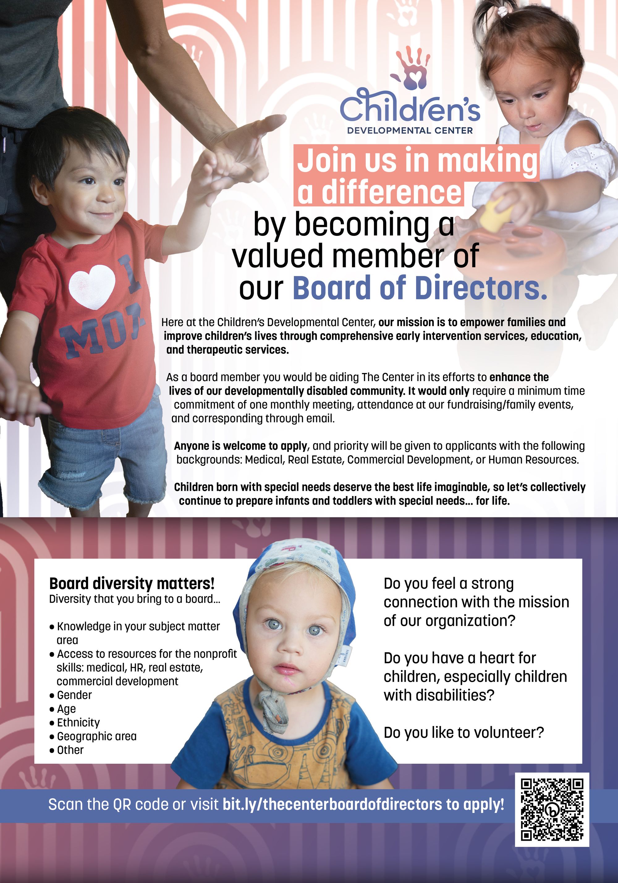 The Children’s Developmental Center is always looking for volunteers, individual donors, and business sponsors. Scan the QR code to learn more about what we do! We all know someone with special needs. So, let’s collectively continue to prepare infants and toddlers with special needs… for life.