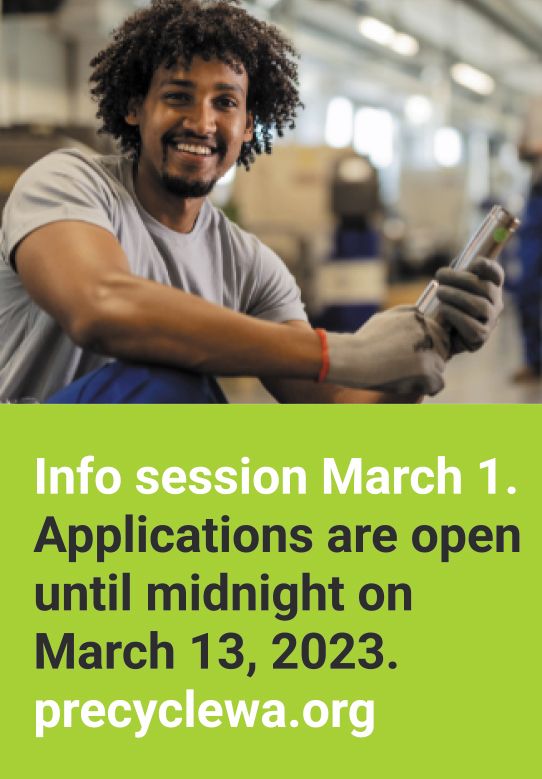 Anyone with a for-profit, nonprofit, community-based, or tribal product, service, or idea — as long as it’s one that reduces, prevents, or creatively reuses Washington waste — is encouraged to apply. PreCycle applications are eligible from any waste-reducing venture in the Pacific Northwest Region that either directly targets or could be scaled to target a waste stream in Washington state. The program is funded in part by the Washington Department of Ecology, and supported by partners across the PNW.