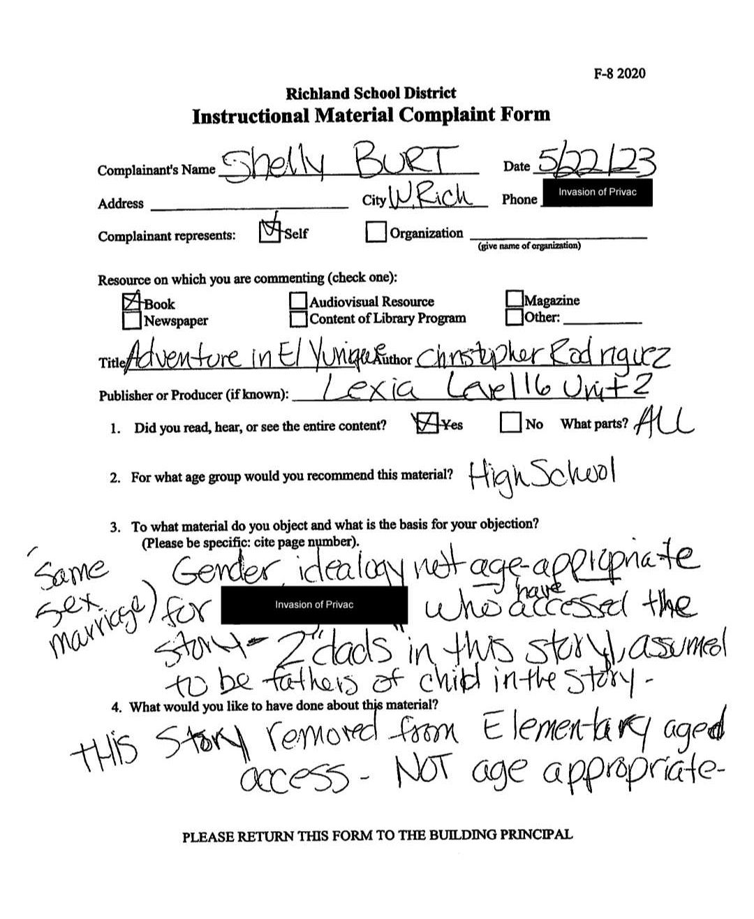 At the July 12 Richland School District board meeting, members of Moms for Liberty Benton County challenged a short story called Adventure in El Yunque by Christopher Rodriguez about a girl named Ana hiking in a rainforest with her family on her birthday. The Moms for Liberty group takes issue with the fact that Ana’s parents are both dads.