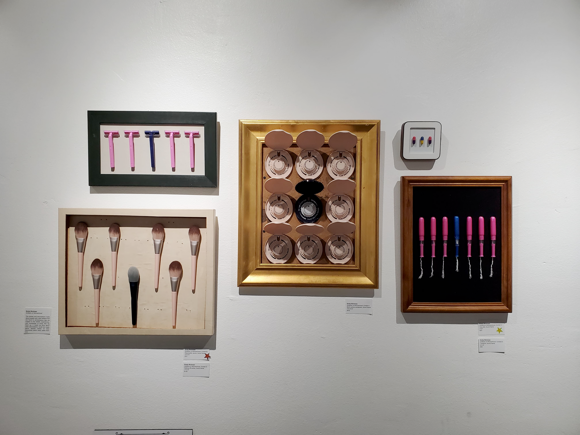 It’s a little of both, I would say. For Are we all met?, I fell in love with the gnomes and knew I would put them in the shadow box but didn’t have the official idea of what it was until I was creating it. For my series on Artifacts of Womanhood, I had initially created the birth control piece many years ago because I liked it aesthetically. The rest of the pieces were conceived by thinking about what other ‘artifacts’ one might associate with womanhood, and I collected them to create the series.
