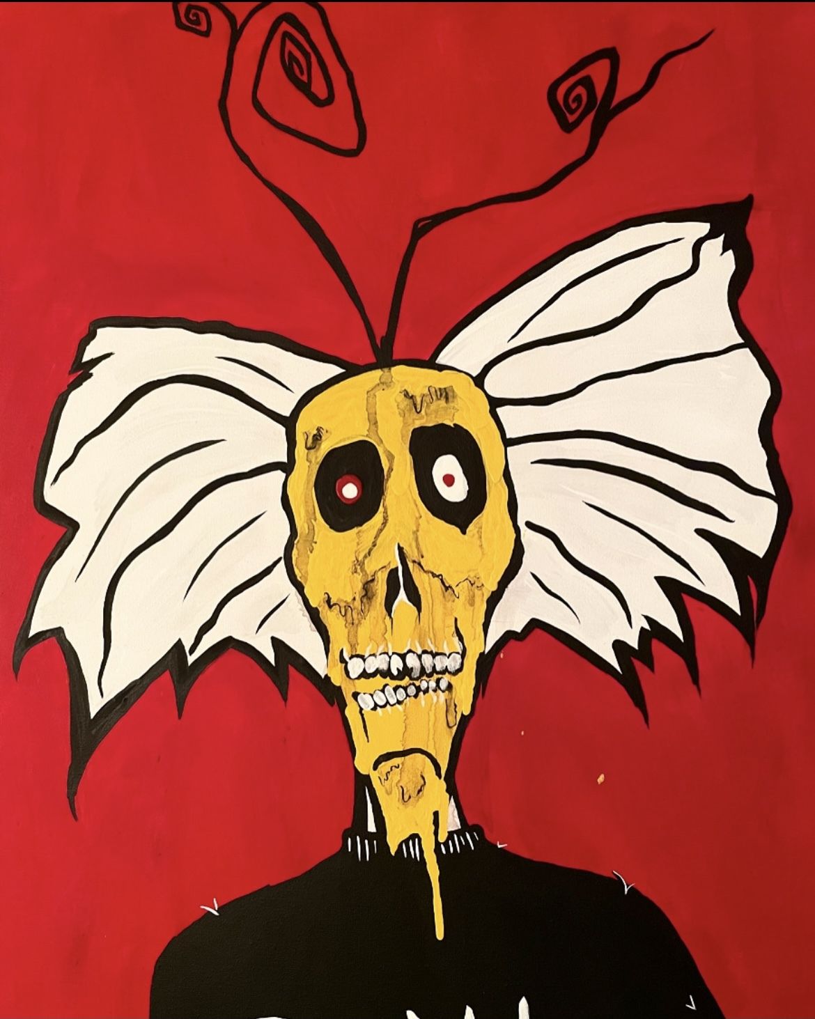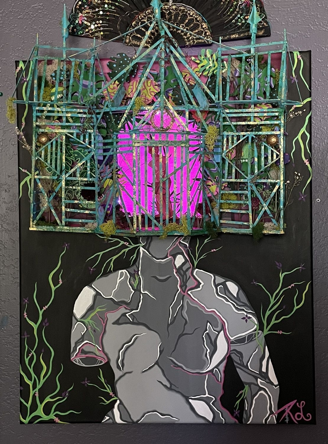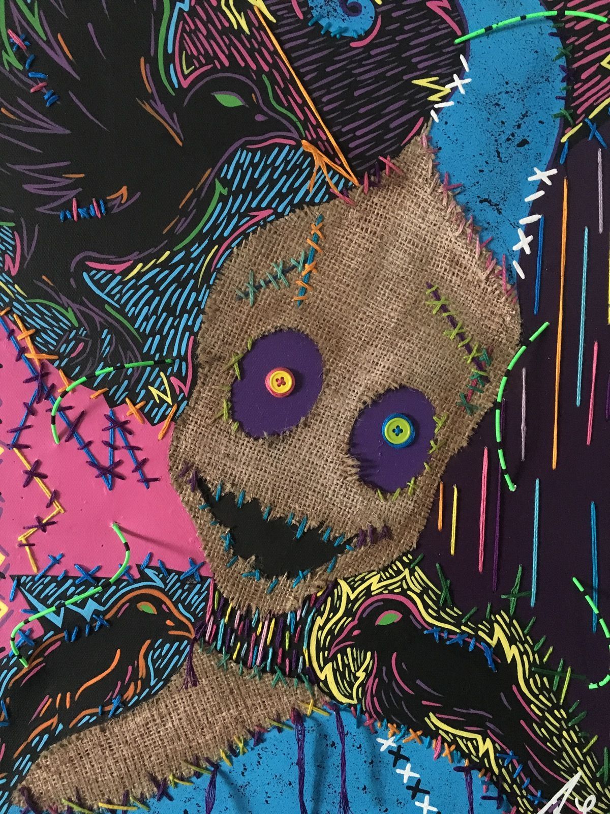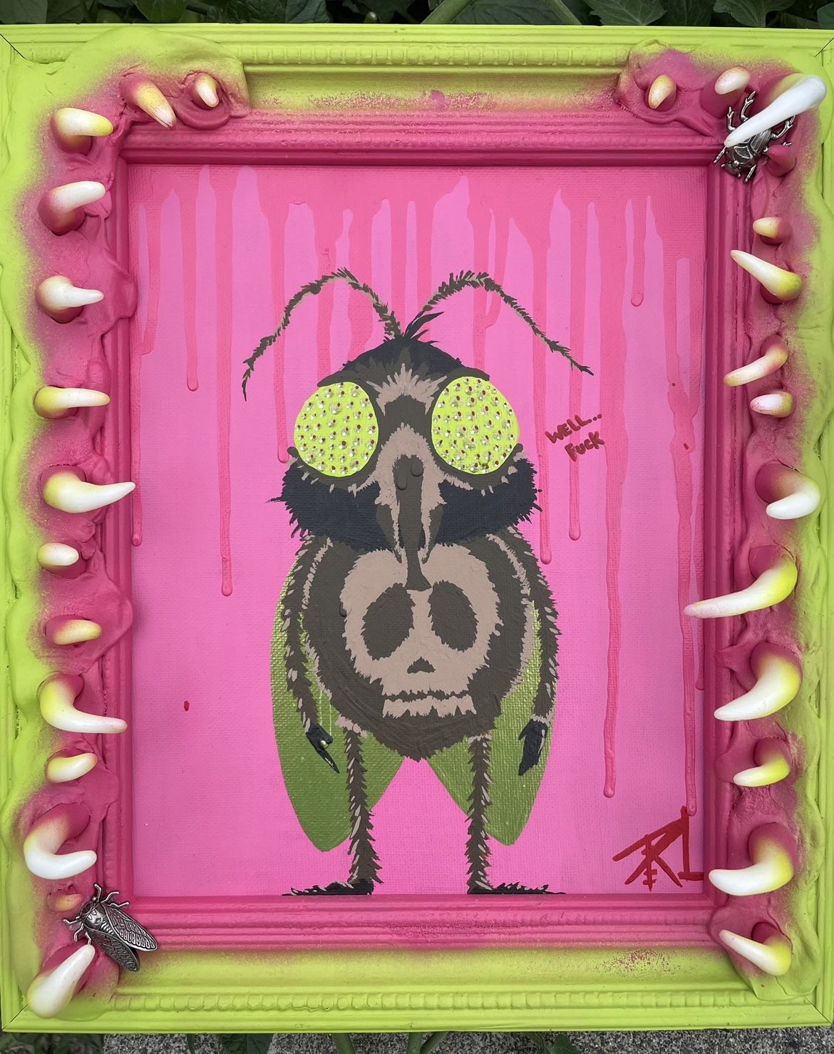 Long often adds 3D objects to 2D surfaces, creating art pieces that have a mix of textures, mediums, and repurposed objects. She draws inspiration from all things creepy and unusual, and she enjoys combining dark themes with bright colors and hidden meanings. She also has a softer side to her art, inspired by friends and family.