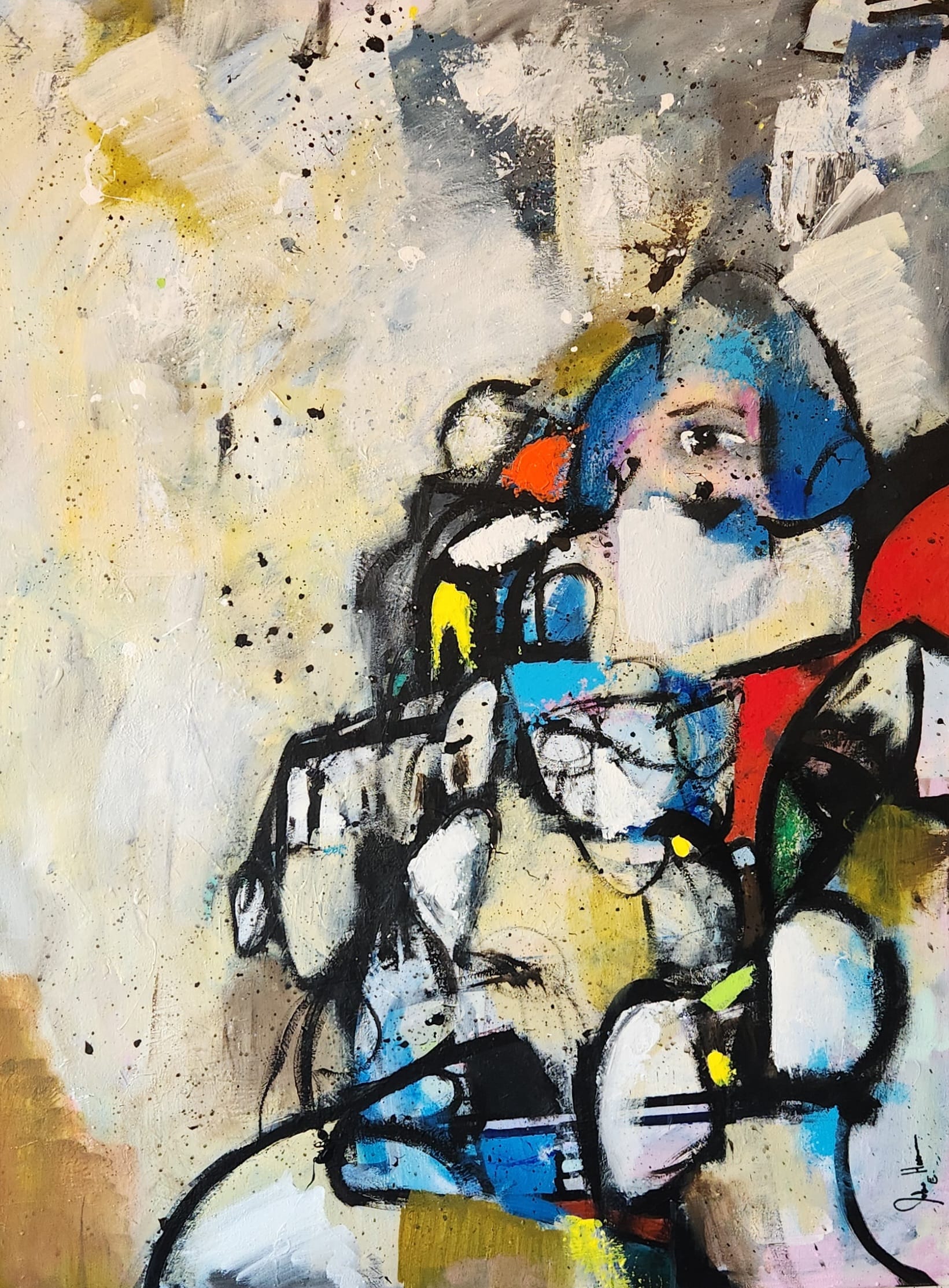 J.E. Hannum is a contemporary abstract artist. He creates dynamic, cubist-style paintings, meticulously crafted with acrylic, oil, pastel, and charcoal. He uses brushes, palette knives, his hands, and many other tools to apply paint to canvas.