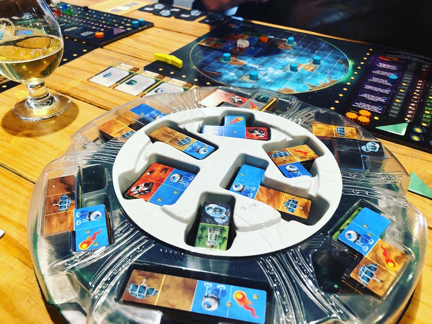 To start, give everyone a player board showing the image of a planet with a grid laid over it and a Progress Tracker sideboard. Each player gets two Rovers, 5 colored cubes to track progress, 6 Life Pods to place on their Planet Boards, and a couple of colored chits to denote player color and pull location on the Lazy Susan (I’ll get to that in a minute). Then, shuffle and deal one Objective Card between each player. Objective Cards between two players are shared between you and the player next to you. Shuffle and create a deck of Civic Advancement cards for each of four Civ levels and place the Lazy Susan in the middle of the table. Each player then places one of their colored chits around the Lazy Susan pointing to one of its six tile bays. Decide who gets to be the Space Commander (SC) — the first player, which will rotate throughout the game — and begin play.