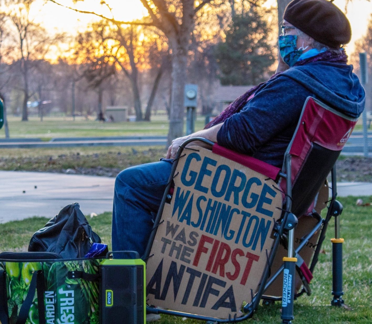 From late June of 2020 right up to today, I protest twice a week on the corner of Columbia Center Boulevard and Quinault Avenue. Being a senior, standing and walking for long periods of time can be difficult for me, so I protest from a chair. I don’t keep any schedule (in order to discourage potential stalkers) but I try to protest for ninety minutes, twice a week, barring illness or bad weather.