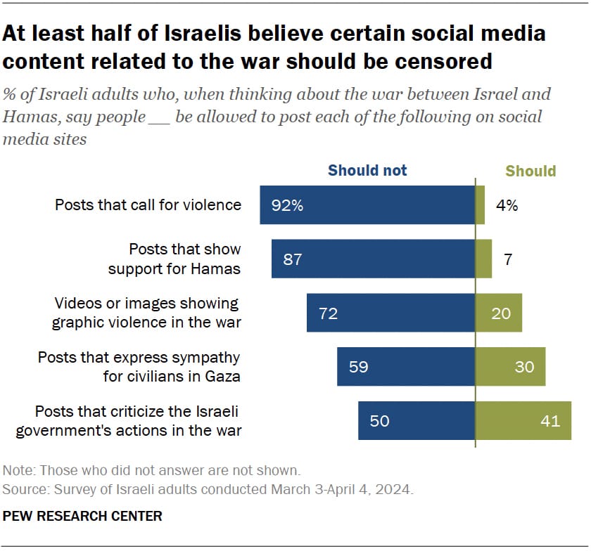 ‘Hasbara’ is a public diplomacy technique used by Israel to cultivate a positive public image by controlling the information presented to viewers. Hasbara is so effective that polling in November 2023 found that 57.5% of Jewish Israelis believed that the IDF was using too little firepower in Gaza. In Jan 2024, the Peace Index found “an absolute majority (88%) also justifies the scope of casualties on the Palestinian side when considering the goals of the war.” In February, 68% of Jewish Israelis said they oppose the transfer of humanitarian aid into Gaza by organizations that are not affiliated with Hamas or UNRWA. Most recently, at the end of August, Pew Research found that at least half of Israelis believe that social media posts that criticize the Israeli government’s actions in the war and posts that express sympathy for civilians in Gaza should be censored.