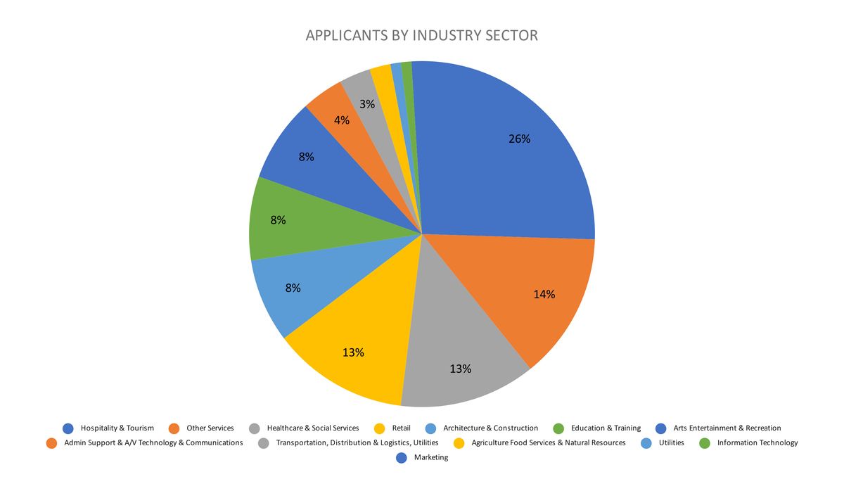 Benton County’s BRI program has helped a wide breadth of small businesses across many industries, with twelve named sectors represented in the first two rounds of applications. A majority of applications have come from the Hospitality & Tourism, Healthcare & Social Services, and Retail sectors, making up 52% of the received applications. Please note that this data does not represent how funds were allocated across industries, but rather the breakdown of applications received by the BRI.