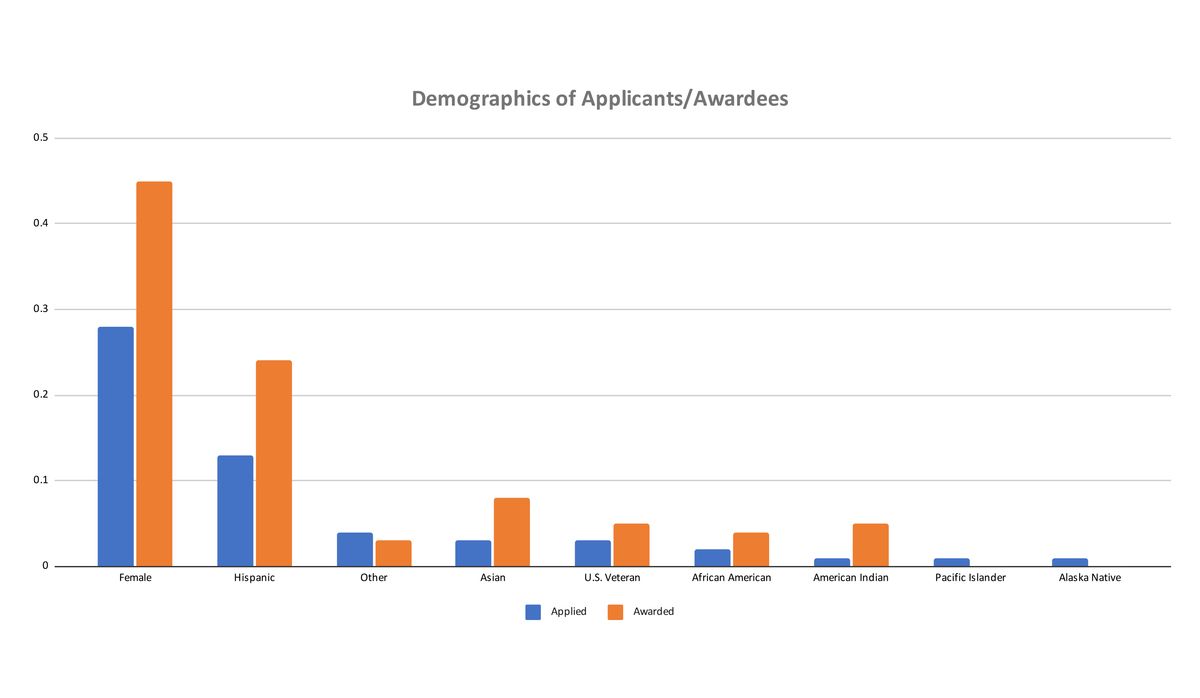 Benton County’s BRI Program has provided a significant level of assistance to members of typically underserved communities through the end of the second application period. Women-owned businesses accounted for 28% of applicants and were awarded 45% of funds (approximately $900,000.) Additionally, Hispanic-owned businesses accounted for 13% of applicants and were awarded 24% of funds (approximately $480,000.) It is important to note that these percentages are relative to the total funds awarded and not to each other, as business owners can be members of multiple demographic communities.