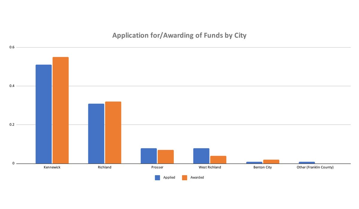 Seven different cities applied for grants from the BRI program as of the end of the second phase of grant awards, while six cities were awarded funds. Funds were awarded fairly proportionally to the percentage of applications by city. Kennewick was the beneficiary of both the highest share of funds and the highest marginal difference between applied for and received funds, having been awarded 55% of grant money through phase two (approximately $1.1 million) while applications from the city total 51% of the total submissions. West Richland was allocated the lowest share of funds relative to their applications submitted. receiving only 4% of the grants available (approximately $80,000) with applications totalling 8% of the aggregated submissions. One of the qualifications for the BRI program states that the business has “Headquarters or main office physically located in Benton County where a majority of employees are assigned.”1 This presumably explains why Franklin County applicants did not receive any funds.