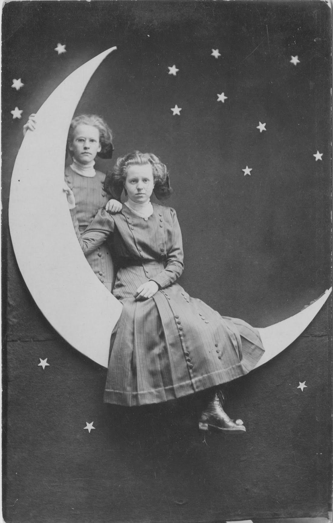 The two girls in this paper moon are very, very serious. Try not to be this serious when you are given the opportunity to hang out somewhere fun, like in a paper moon.