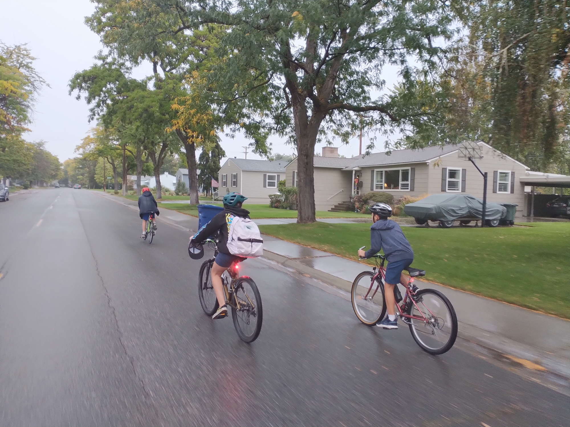 From November through March, it’s a good idea to always ride with a red taillight. Our days are gloomy, and it makes a huge difference for visibility. In my opinion, a red light is more effective than dressing your children in fluorescent yellow from head-to-toe, and they are a thousand times more amenable to it.