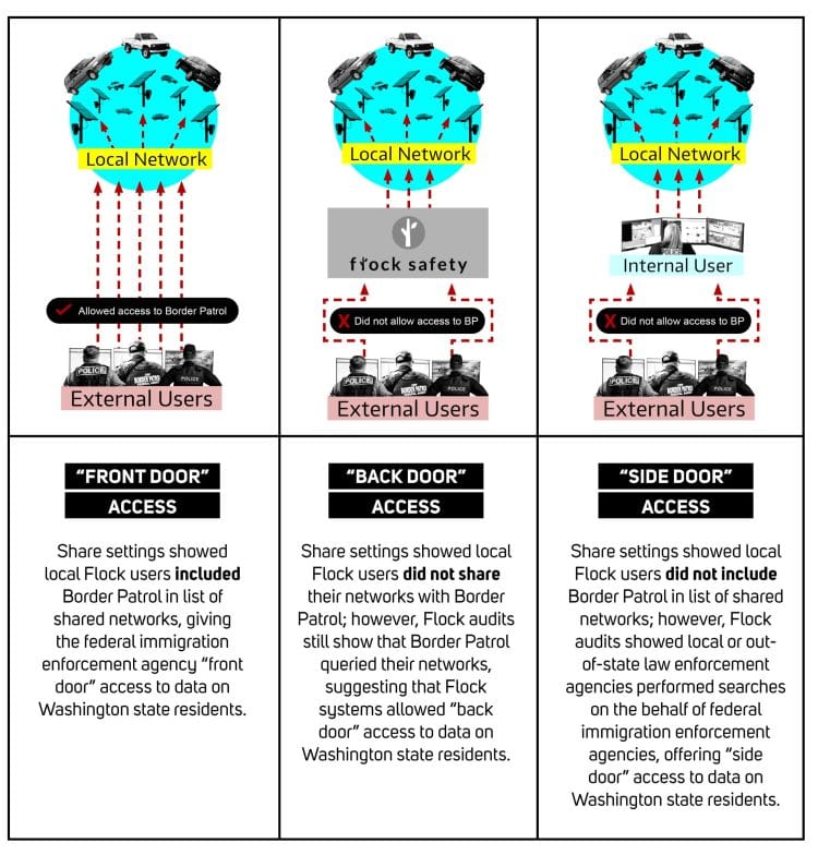 In a study published October 21 of this year titled ‘Leaving the Door Wide Open: Flock Surveillance Systems Expose Washington Data to Immigration Enforcement’ by the University of Washington Center for Human Rights, researchers found that many municipalities in Washington had their Flock systems accessed by federal law enforcement, including U.S. Border Patrol. At least seventeen Washington agencies with Flock systems were found to have been searched by Border Patrol. The study examined data obtained through public records searches and found that the Flock data was shared three ways: ‘front door’ access, ‘back door’ access, and ‘side door’ access.