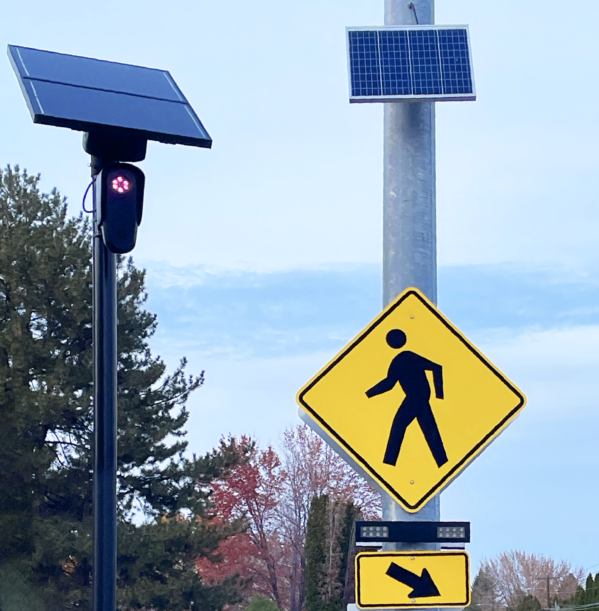 The cameras, made by Flock Safety, are mounted on a pole and powered by a solar panel. Each camera photographs the rear of every vehicle that passes it, including the license plate.
