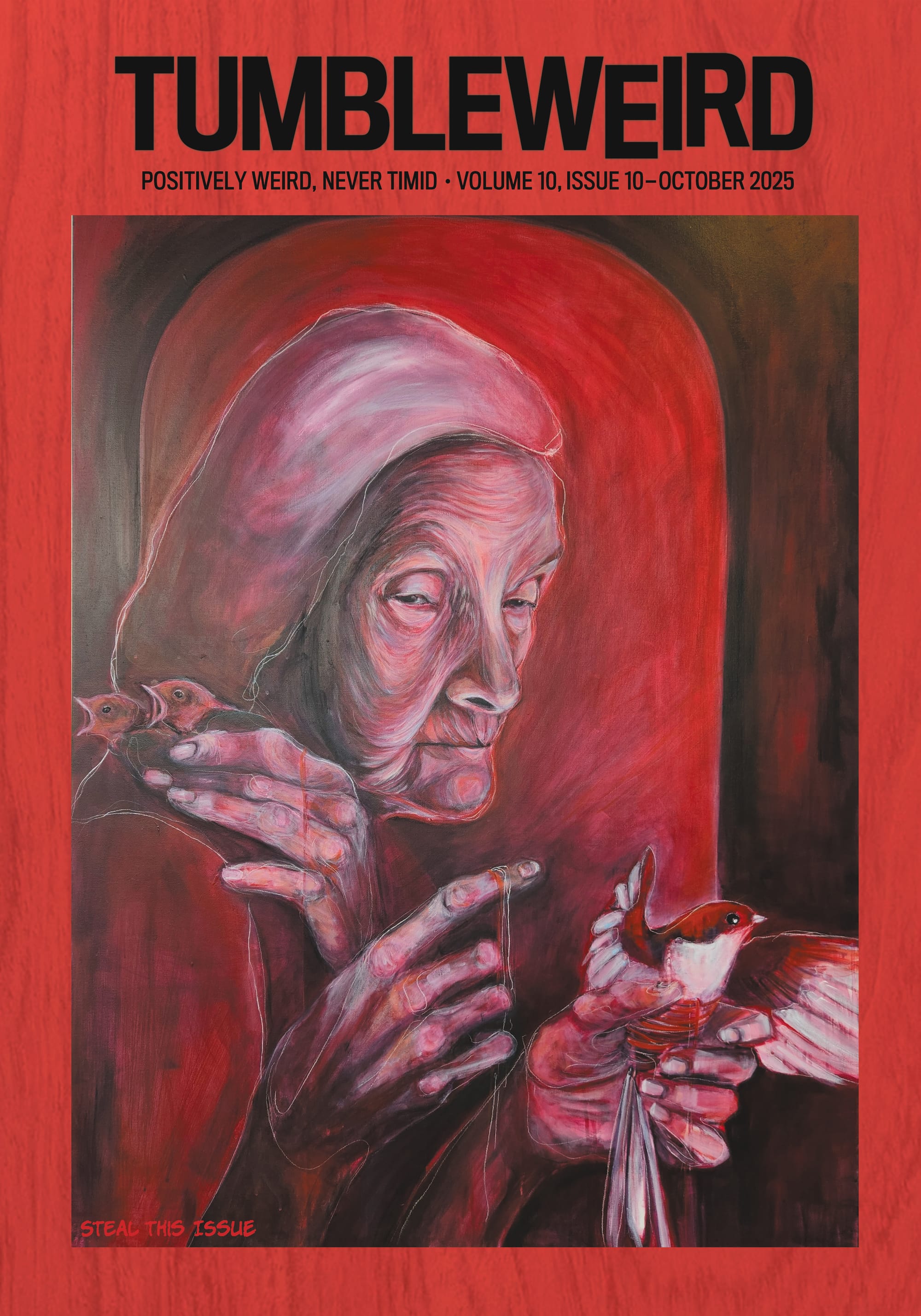 Our cover artist this month is TUMBLEWEIRD's Arts Editor, Ashleigh Rogers. Ashleigh recently had a show at Cafe con Arte entitled The Threads Between Us, "a group art exhibition that explores the stories we carry and the connections we share. It is a celebration of resilience, connection, healing, and the transformative power of storytelling."