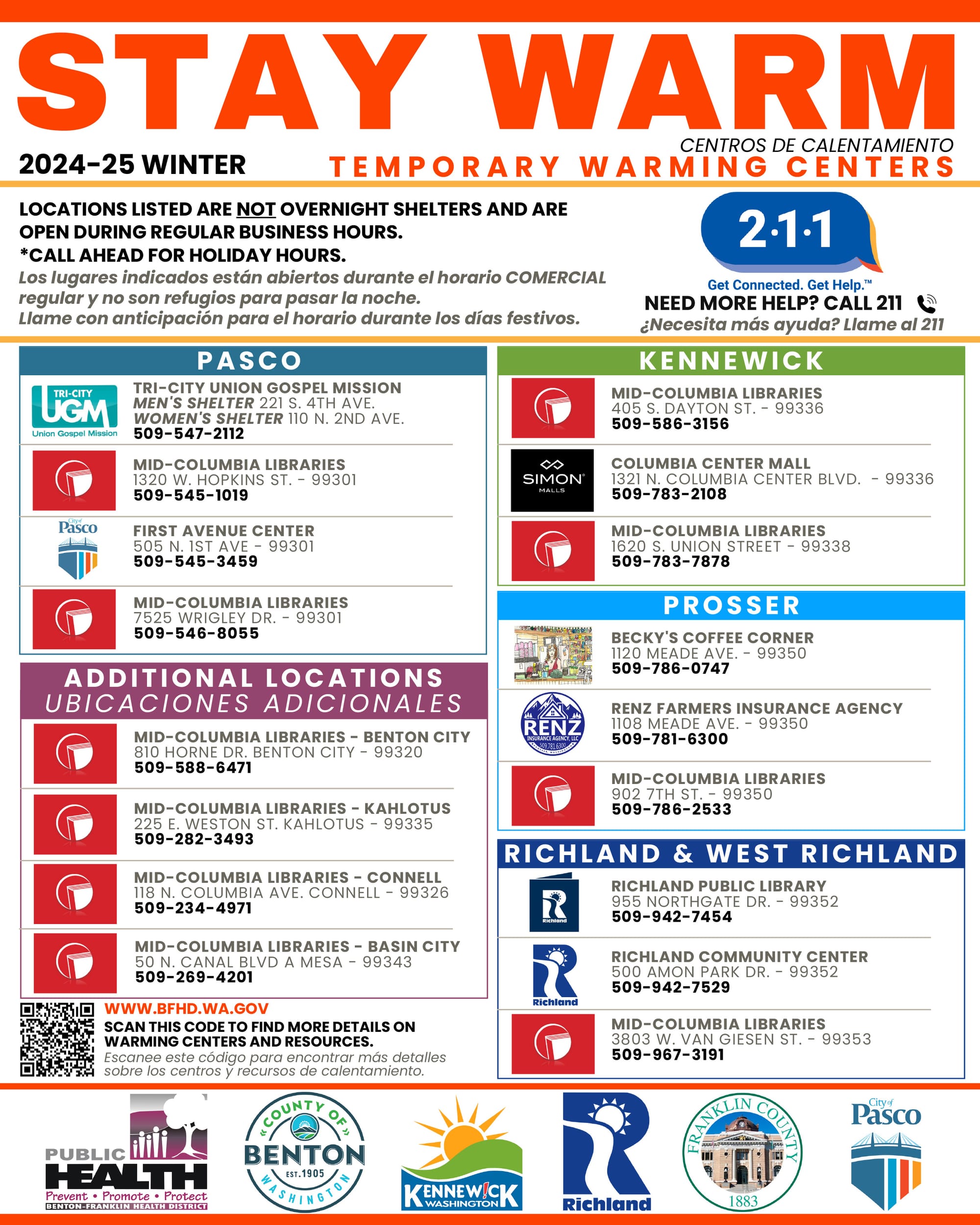 If you are a business interested in establishing a warming center/shelter, please visit https://go2kennewick.com/CivicAlerts.aspx for more information, or contact the Building Departments and Fire Departments in your area: