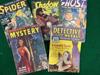 The pulp mystery stories included: The Shadow, Black Mask, The Spider, Detective Story Magazine, Dime Detective Magazine, Ghost Super Detective, Real Detective Tales, Spy Stories, Mystery Stories, Detective Tales, Ace G-man Stories, Gangster Stories, Double Detective, Nick Carter Magazine, Operator 5, Mammoth Mystery, and Dime Mystery Magazine.