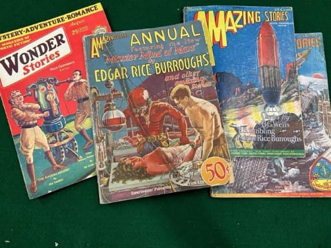 The first science fiction/fantasy pulp was the short-lived Thrill Book, which was published in 1919 and only existed for 16 issues. Hugo Gernsback’s company The Experimenter began publishing the first major science fiction magazine, Amazing Stories, in 1926; in addition, Gernsback was an early promoter of radio and television. He was involved in the coining of the term Science Fiction, although his initial proposal was Scientification. The 1927 Amazing Stories Annual had the classic science fiction cover art of Frank R. Paul for Edgar Rice Burroughs’ Master Minds of Mars. In 1929, Gernsback lost control of the publishing company for Amazing Stories, then went on to publish Pulps in Thrilling Wonder Stories and its associated magazines. Amazing Stores was still being published into the 21st Century, and now it is occasionally available as an online magazine.