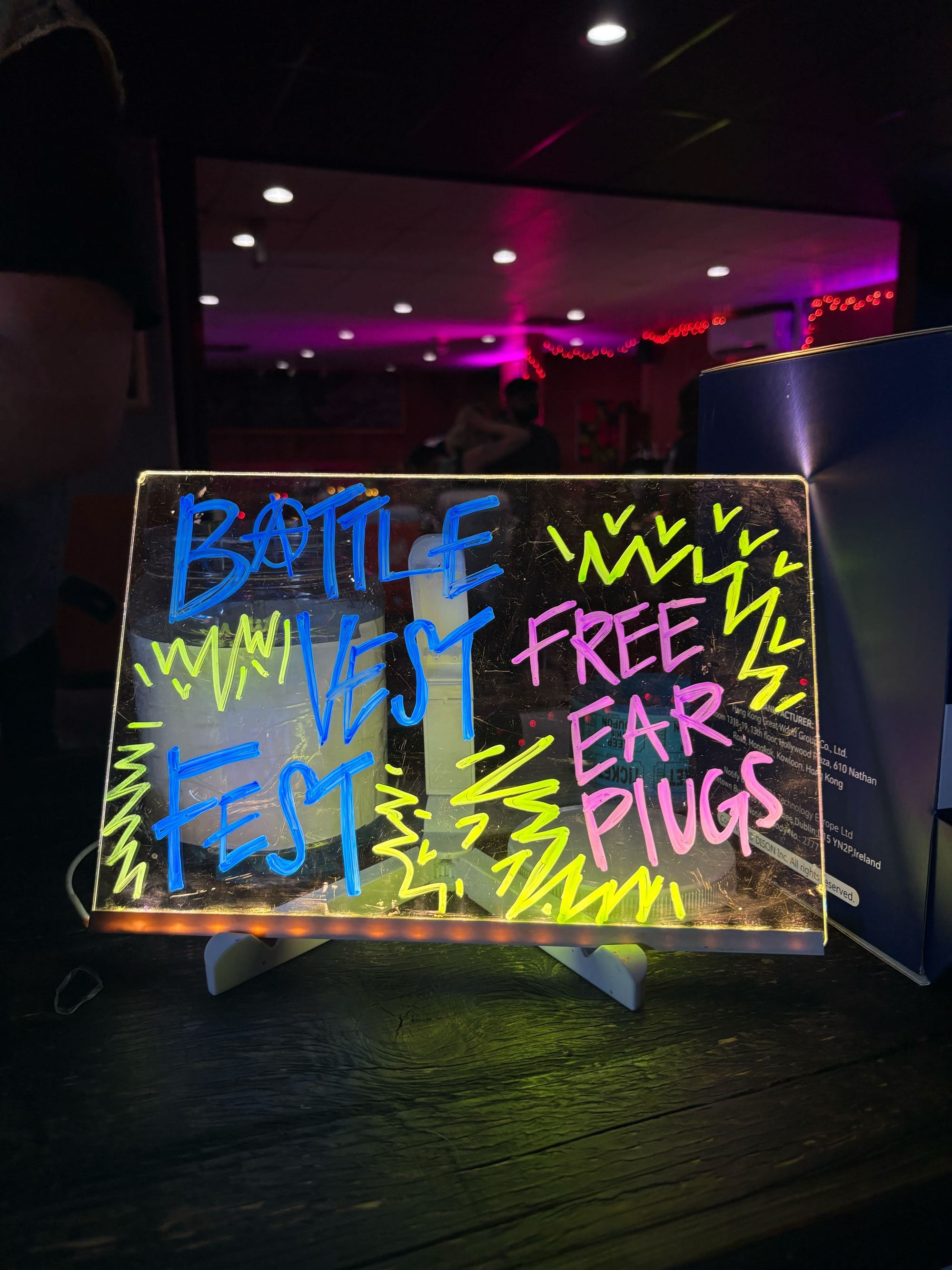 Special lights lit up the floor of the pit, showcasing the Battle Vest Fest logo and set times. Merch was set up throughout the venue, as well as free portrait photography by Scott Butner and live commissions by Lotte Comics.
