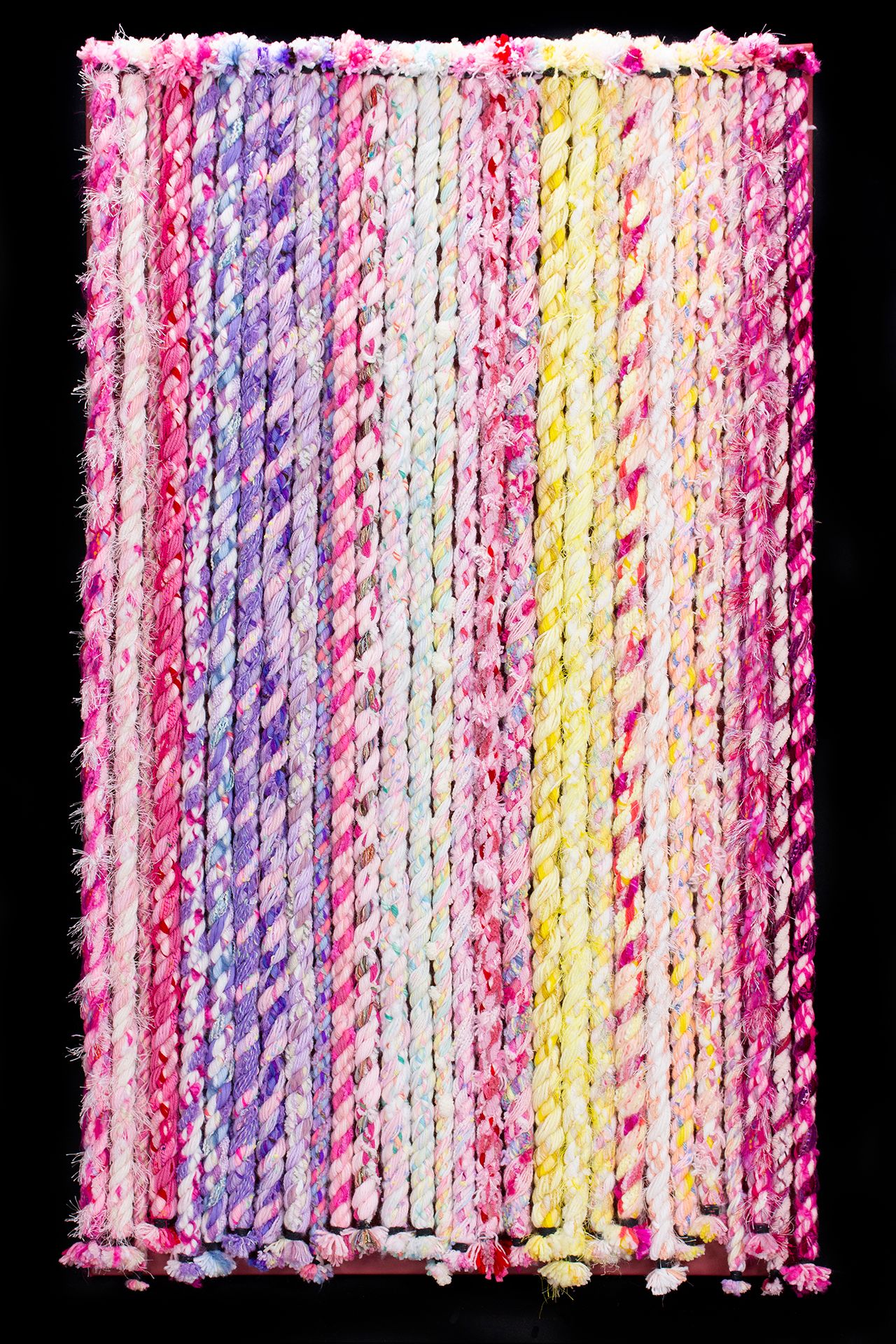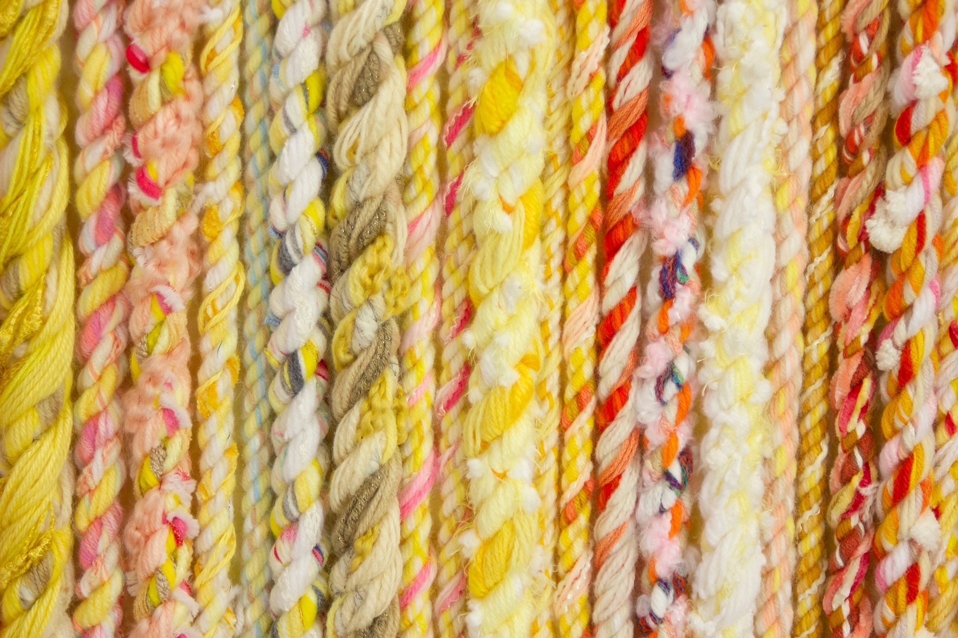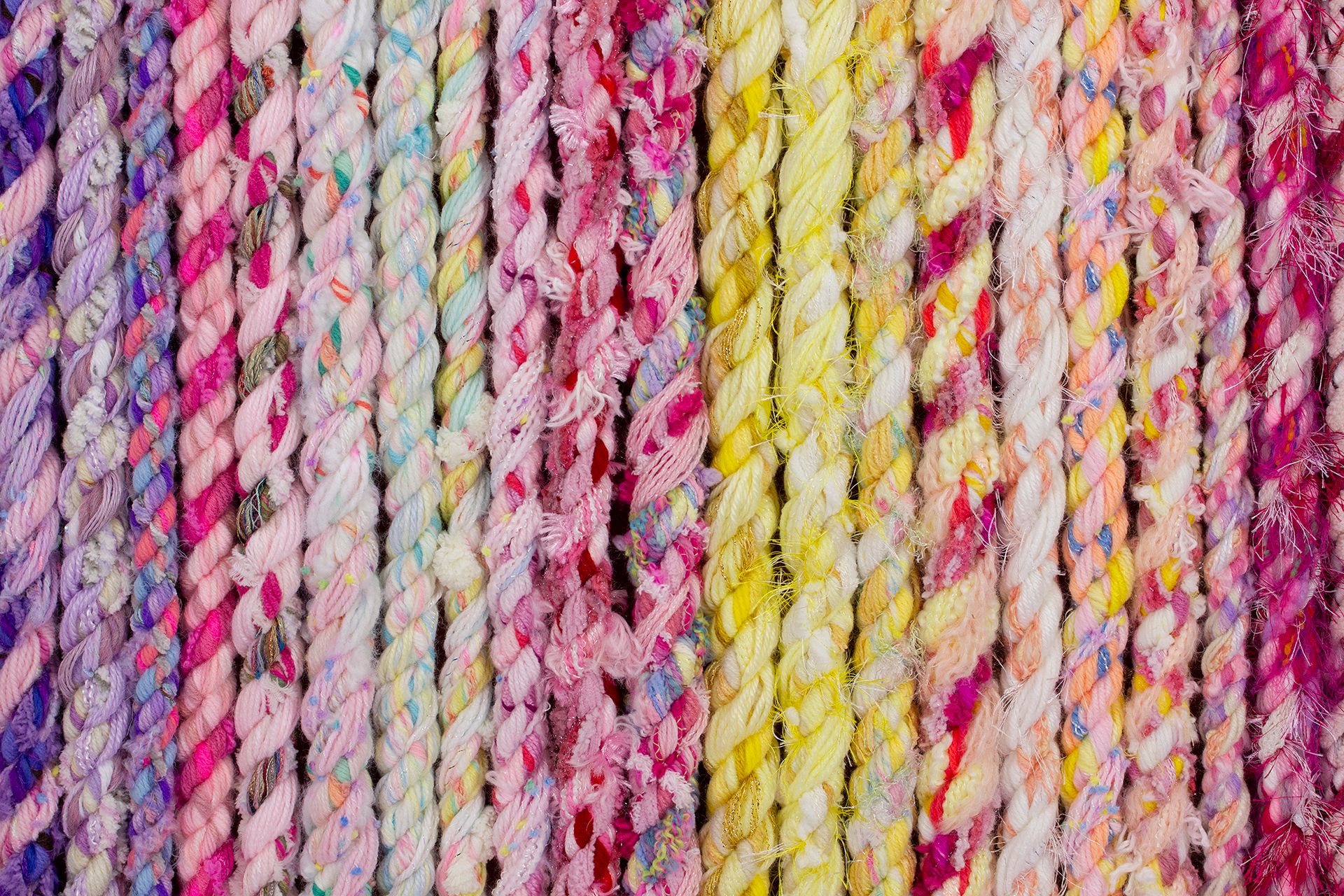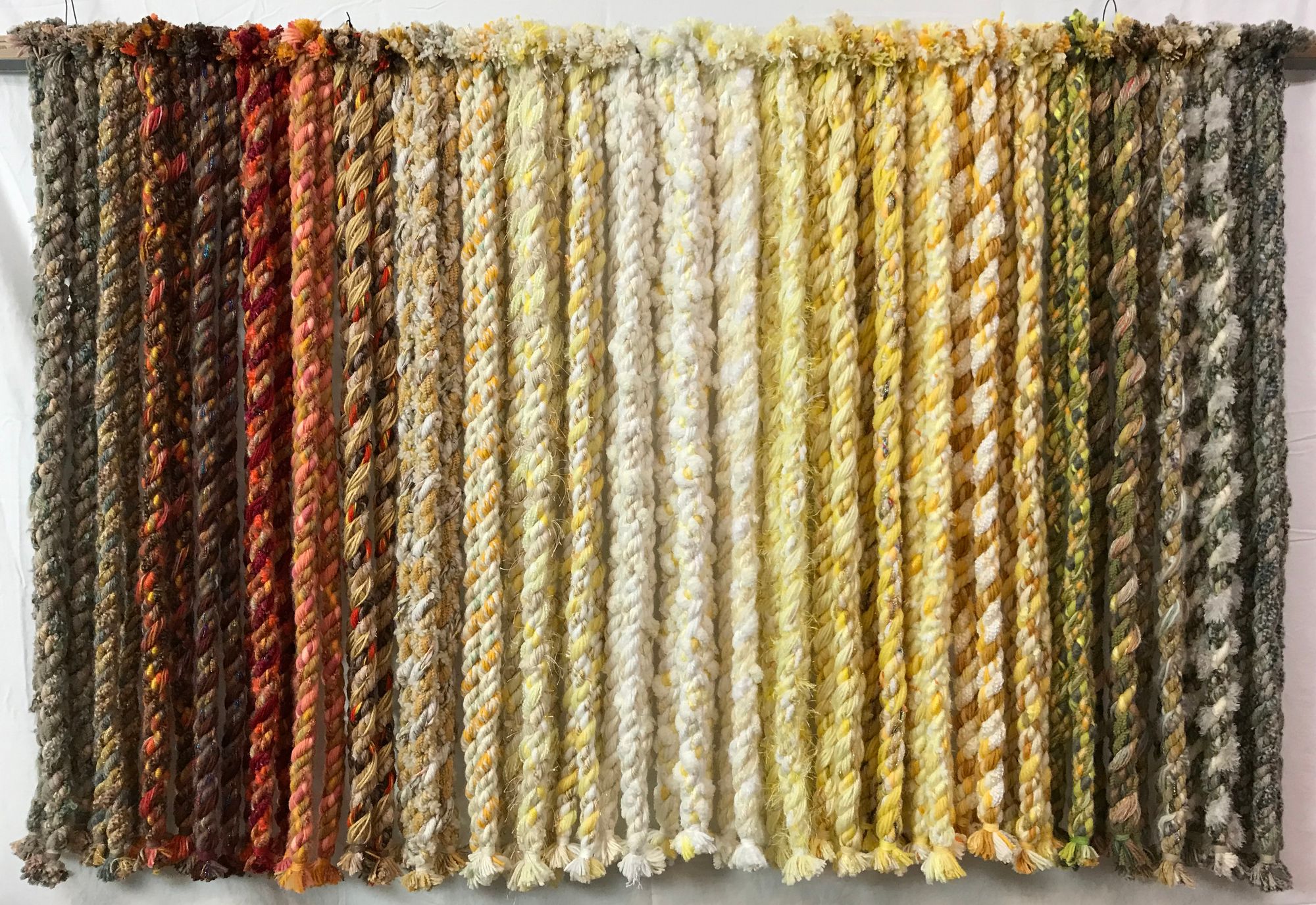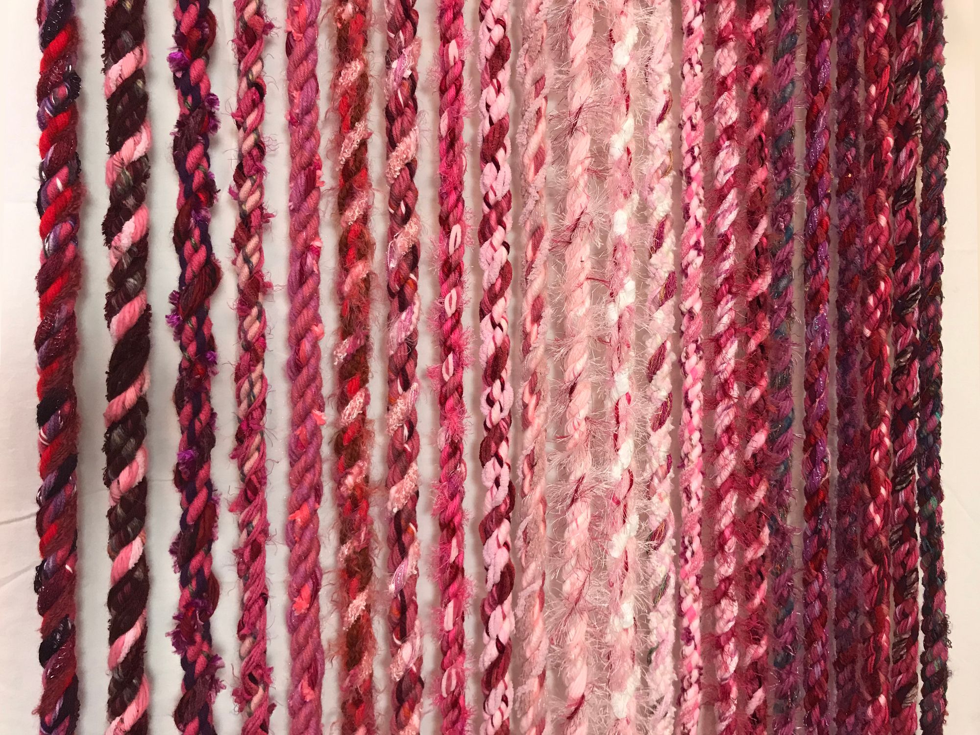 Harding creates his ropes by combining fibers such as yarns, ribbons, and fabric strips. Spinning ropes allows him to utilize his love of color, texture, and pattern. When he first began the project, he found that the ropes he created were surprising, beautiful, and unique. Over time, he discovered how to form different patterns and textural effects.