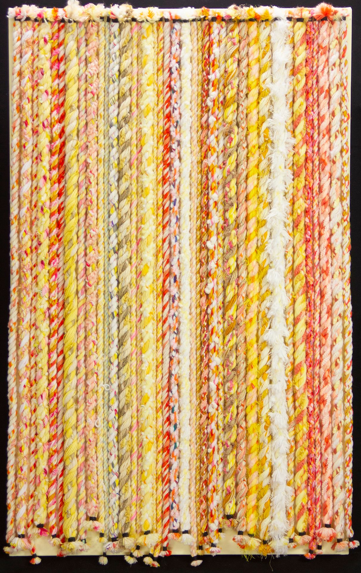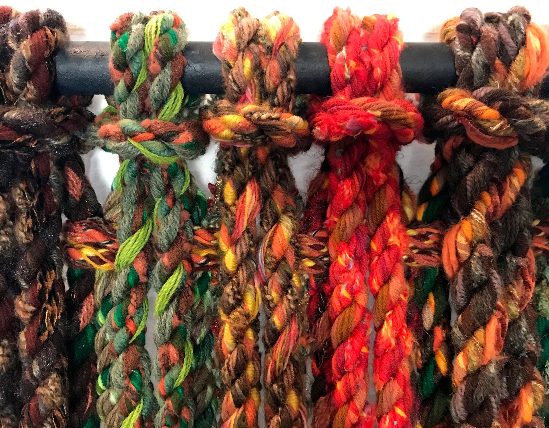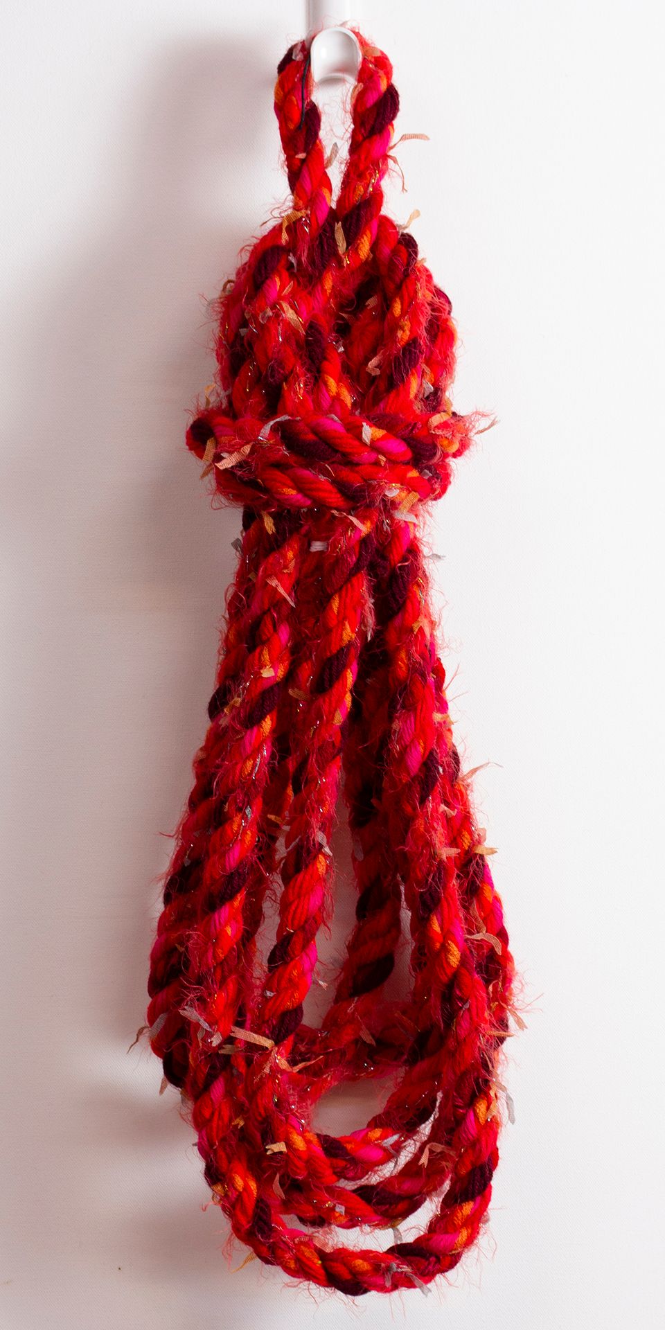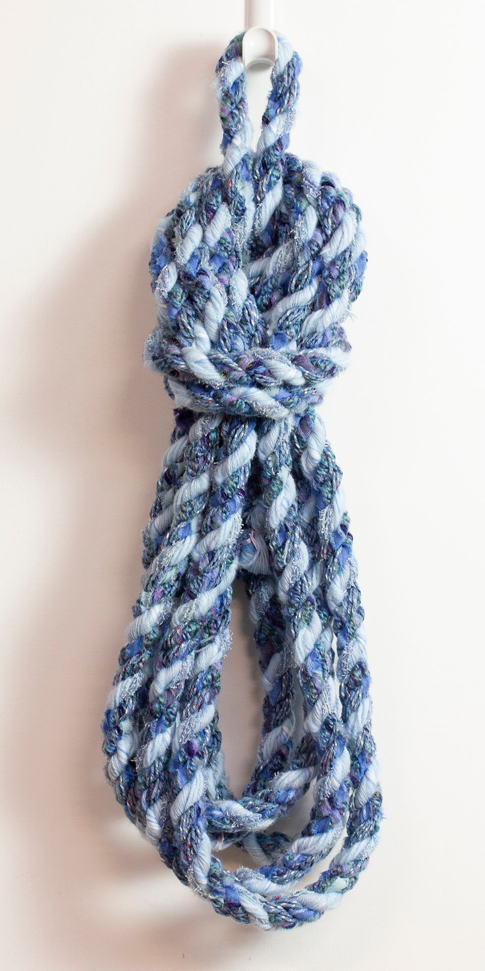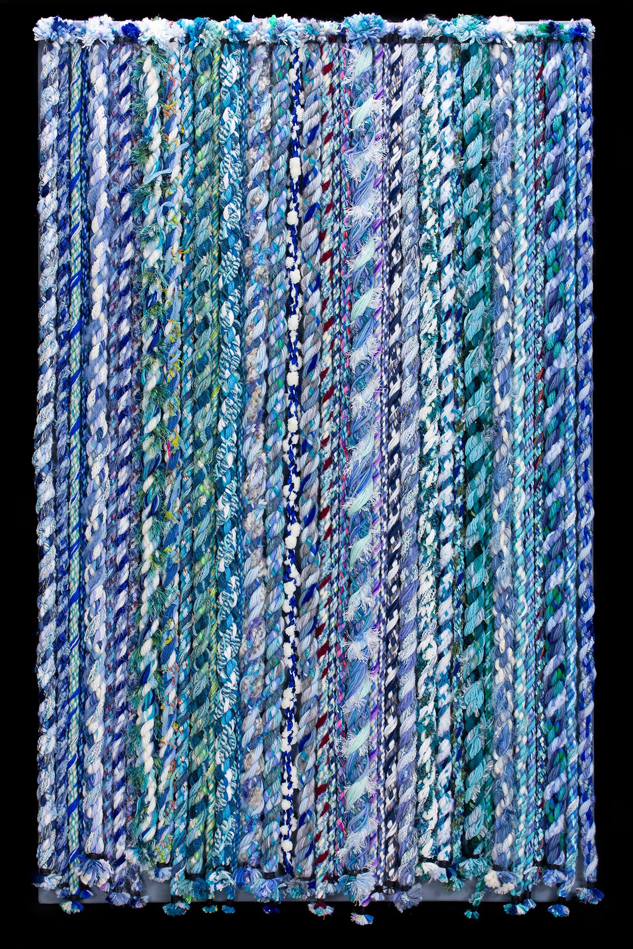 Harding creates his ropes by combining fibers such as yarns, ribbons, and fabric strips. Spinning ropes allows him to utilize his love of color, texture, and pattern. When he first began the project, he found that the ropes he created were surprising, beautiful, and unique. Over time, he discovered how to form different patterns and textural effects.