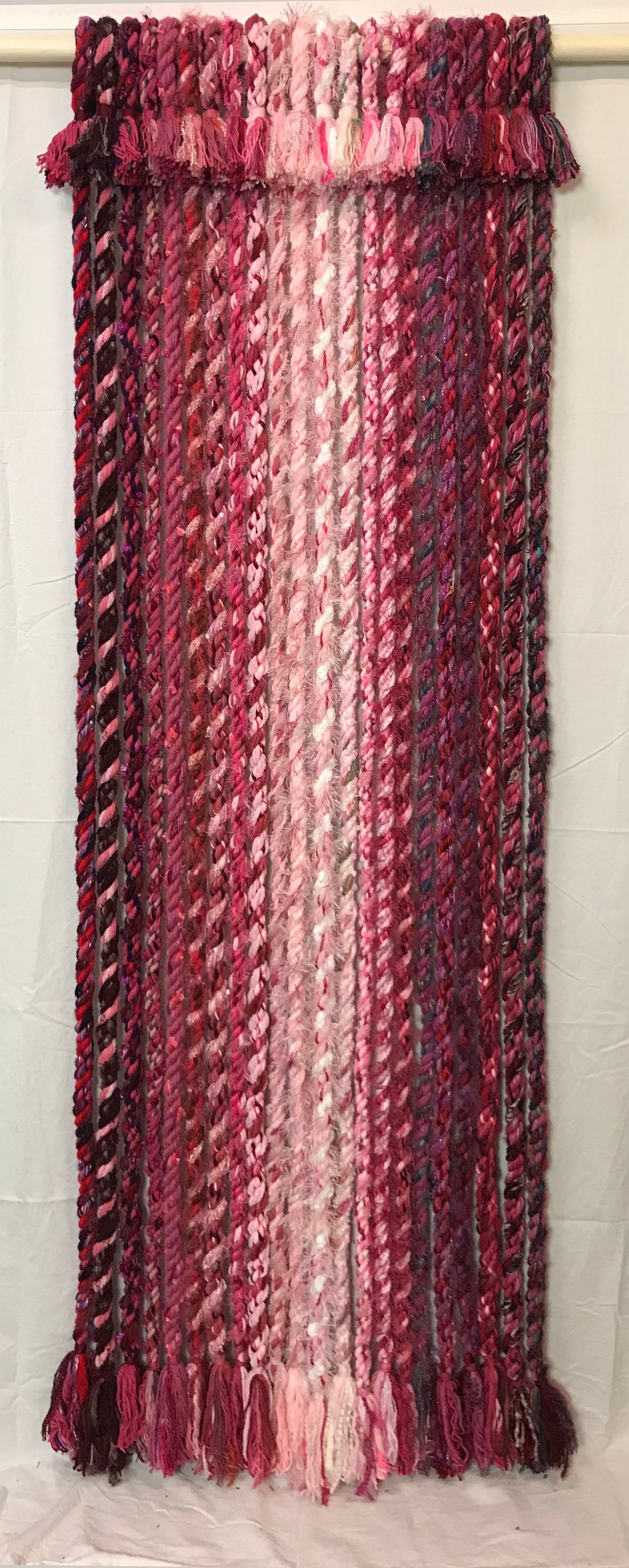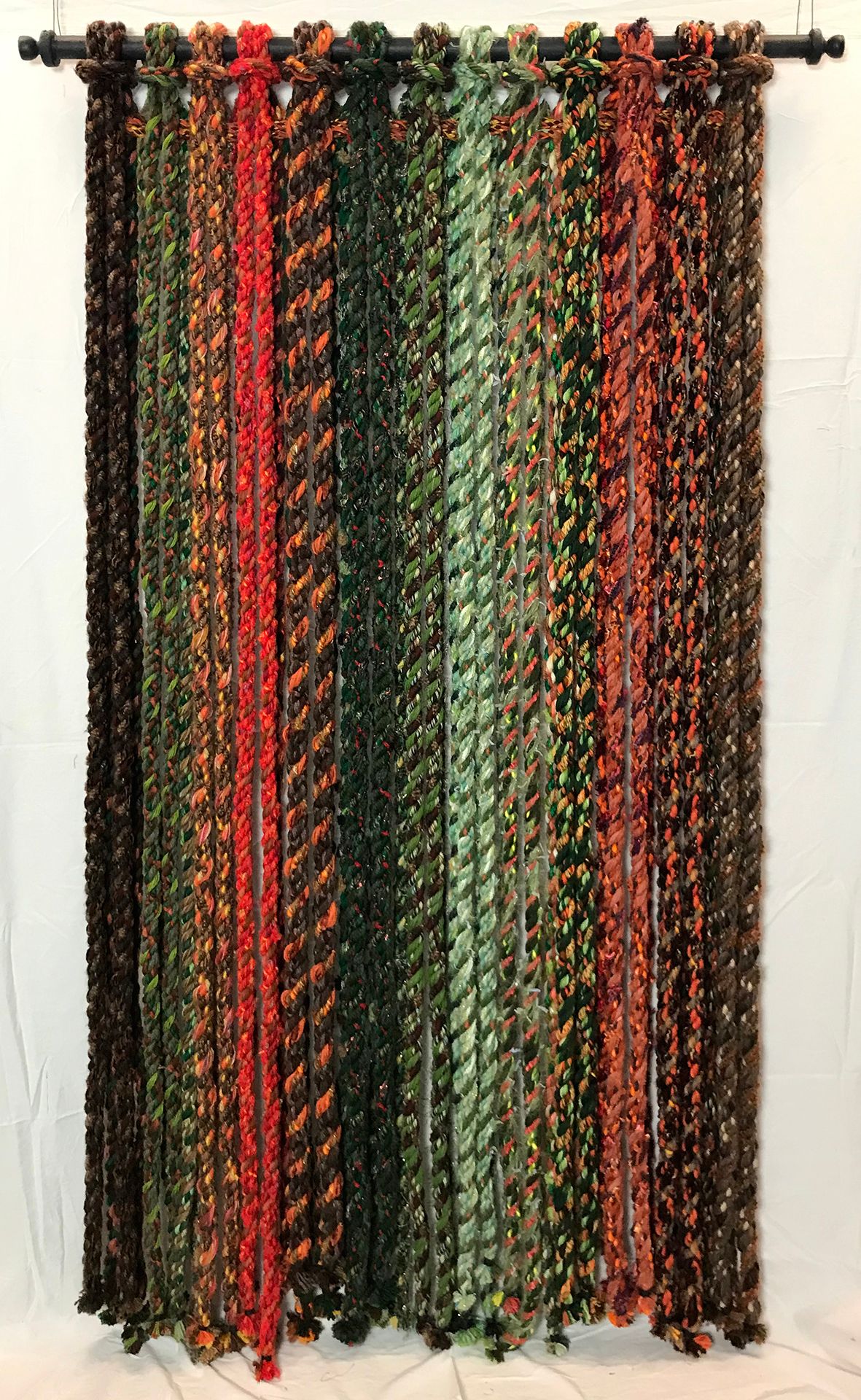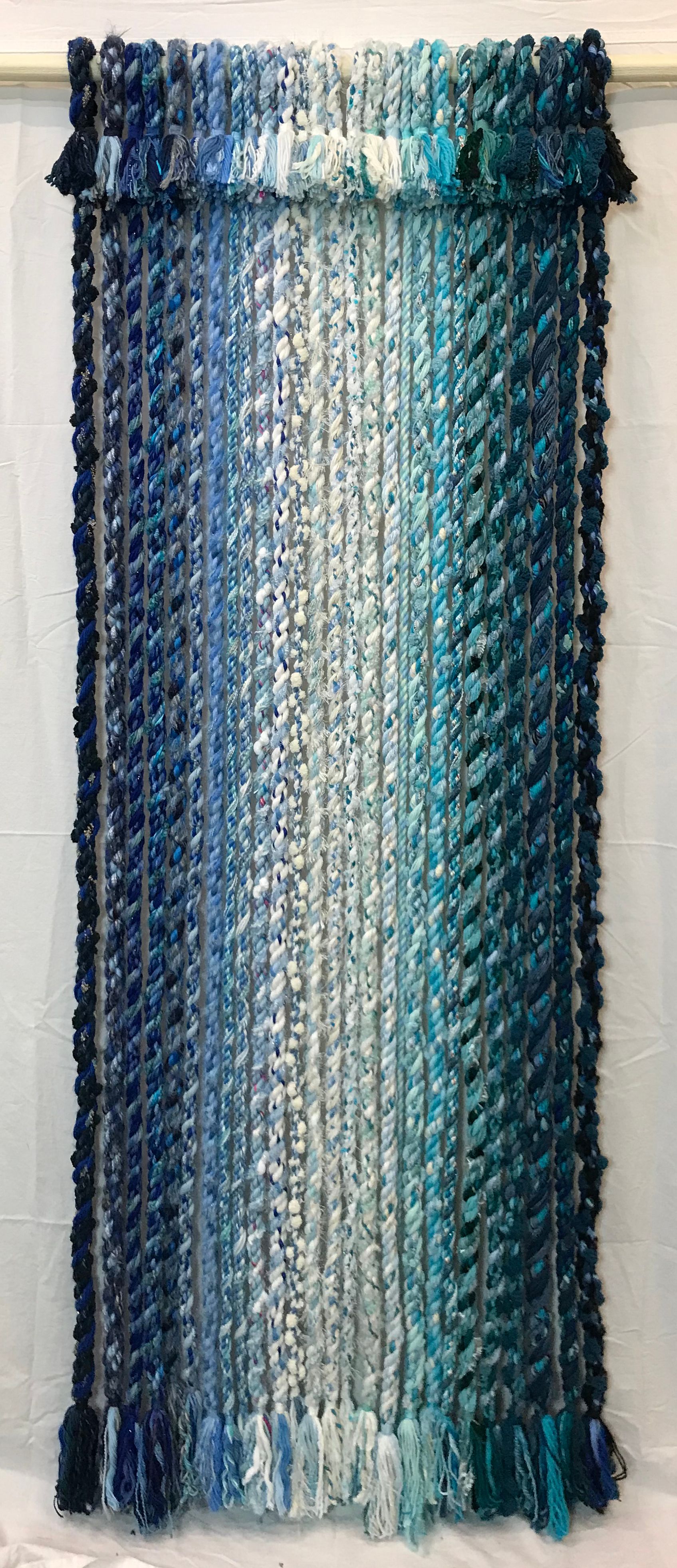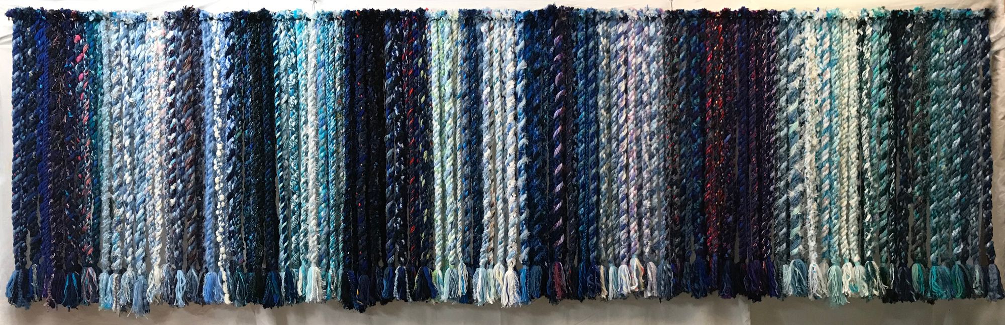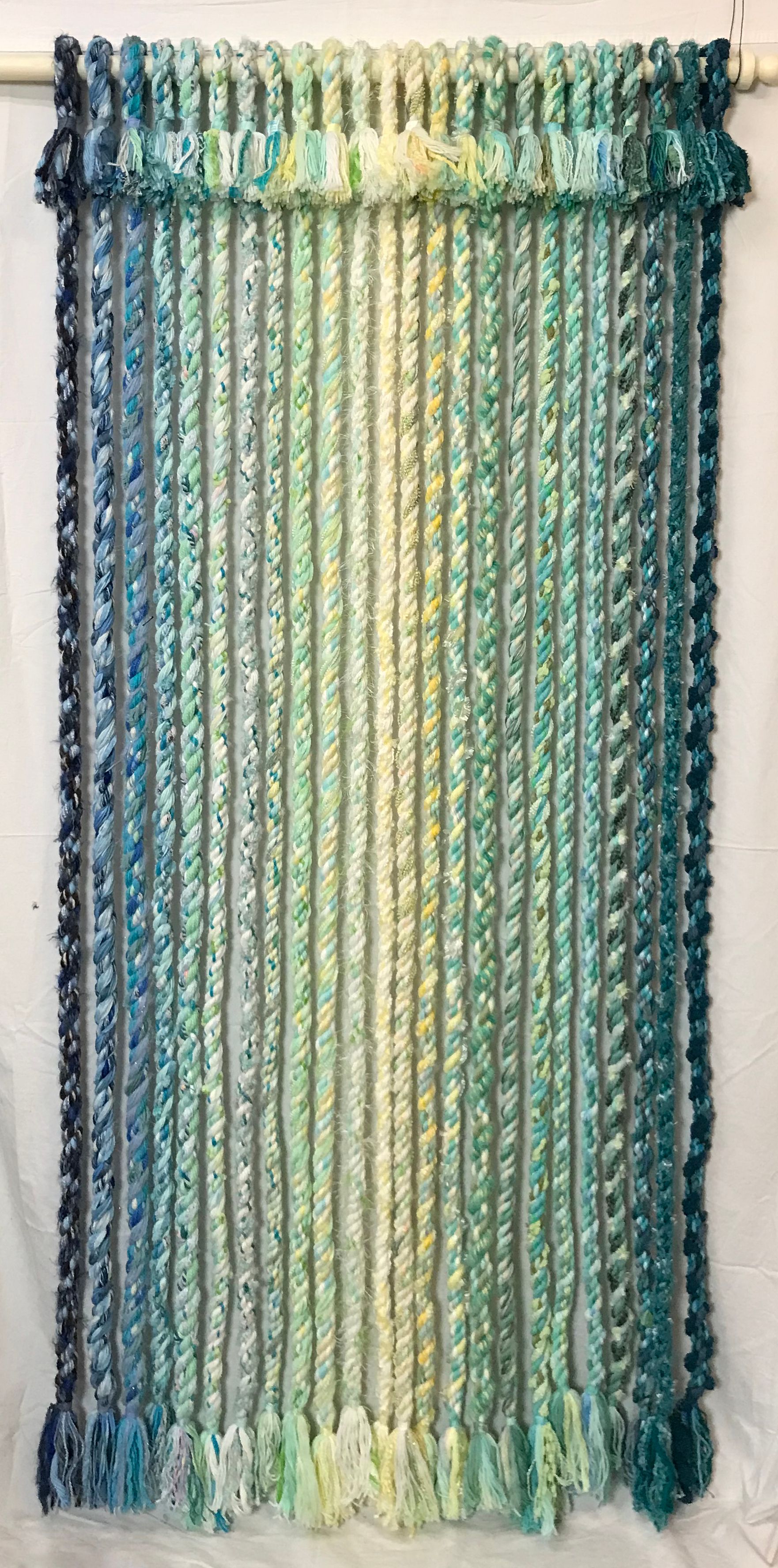December 2022, I stopped making ropes and began making some new, large wall pieces. I first tried some macrame knots but those felt too clunky, so I’ve focused on simple hangings. Most are about 80 to 82 inches tall, hanging loosely from poles. Others are canvas mounted sets of ropes, including a three panel horizontal set that is three feet tall and a full 12 feet wide.
