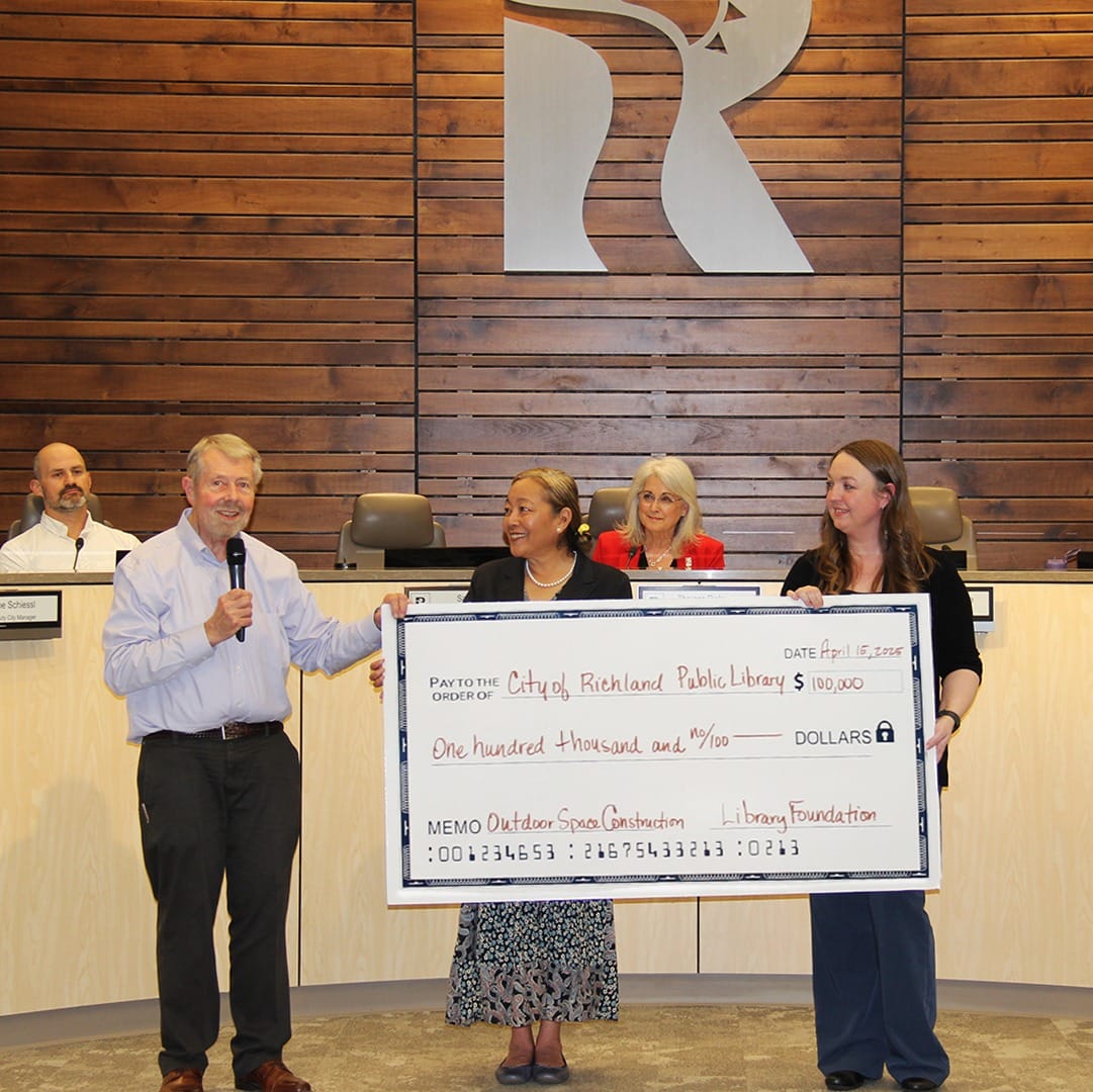 The Richland Public Library (RPL) Foundation Board President Alan Rither and Board Member Kassandra Stanford presented a check for $100,000 to Richland City Council on April 15. The $100,000 will go toward construction of a Children’s Reading Garden and Outdoor Amphitheater on the northwest corner of the library grounds.