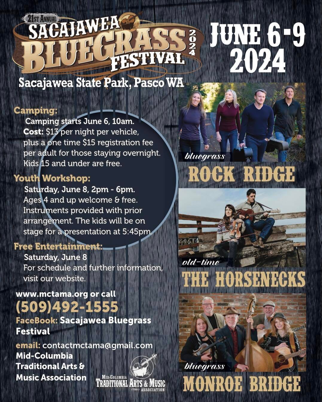 Sacajawea Bluegrass Festival will have a family-friendly, free concert on Saturday June 8, 2024. Open mic starts at 4pm, with a youth workshop presentation at 5:30, and concerts from 6pm to 9pm. On Saturday, everything is free, including parking. Be sure to bring chairs and a picnic meal as there are no food vendors on site.