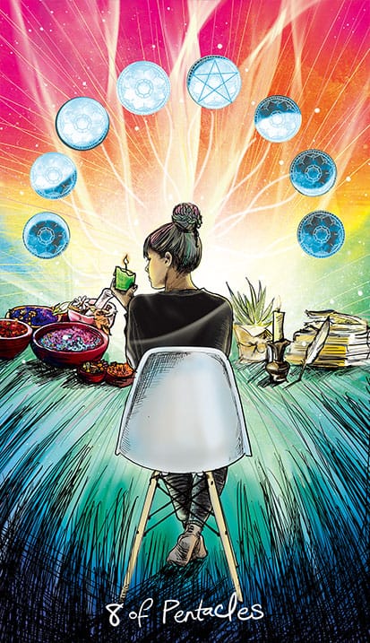 The Eight of Pentacles tells us that we are all learning as we go. Perhaps you are not an expert in government policy, but you are excellent at community organizing. Maybe you aren’t great at community organizing, but you have no problem calling/emailing representatives over and over and over again. You do not need to be an expert to contribute; you just need to be willing to deconstruct what you thought you knew and build again. Start from scratch and learn quickly while you move. This is a hands-on learning process, and you will not get it right every time, but try not to let that discourage you from trying at all.