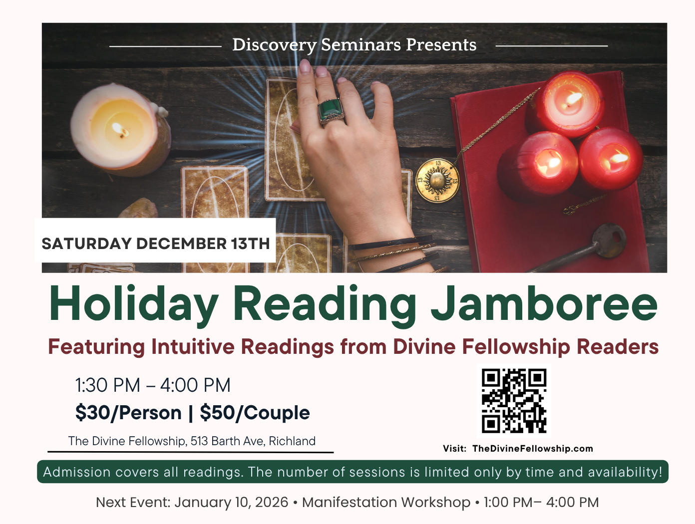 If you would like to explore more about psychic readings, The Divine Fellowship is hosting a Reading Jamboree as part of their Discovery Seminars. Local practitioners will be available to provide readings. Attendees will be able to check out tarot and oracle cards, past lives, crystals, shaman stones, aura readings, and angelic connections.