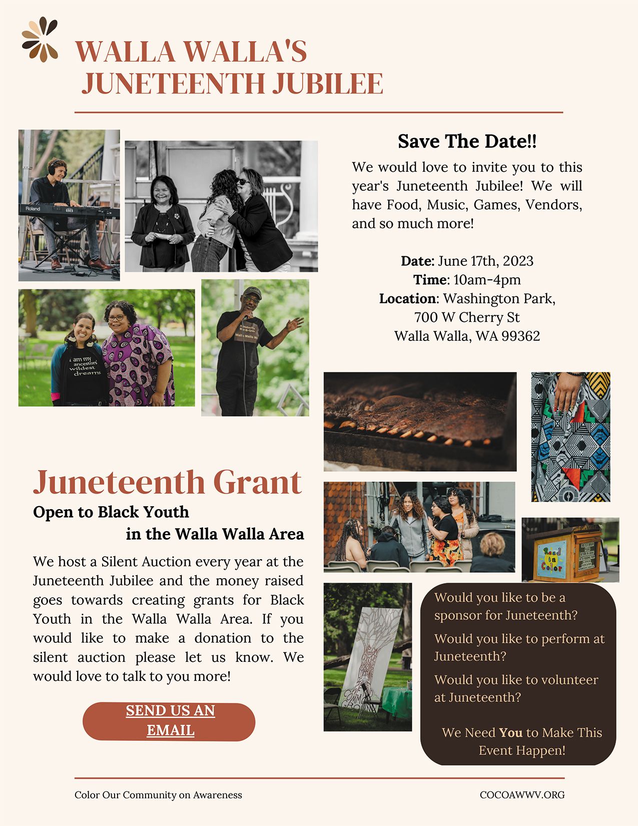 The Walla Walla Juneteenth Jubilee exists to bring people together, share culture, and celebrate freedom for all. COCOA is excited to announce that The Juneteenth Jubilee 2023 is on June 17th at Washington Park in Walla Walla, Washington. This is an event for people of all ages, and will have free food, live music, fun activities, a silent auction, and so much more. We look forward to seeing you there!