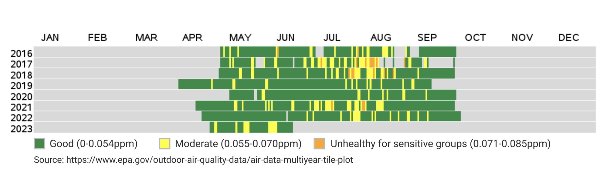 Since 2016, most years have had multiple days over the EPA’s 0.070ppm threshold, except for 2019, 2020 and 2022 (mostly due to COVID). The worst year was 2017, with nine days in this “unhealthy for sensitive groups” state. It doesn’t look like the trend is going upwards (however, COVID years may have thrown the numbers off). We may be even getting better numbers with more electric vehicles in Tri-Cities in the future.