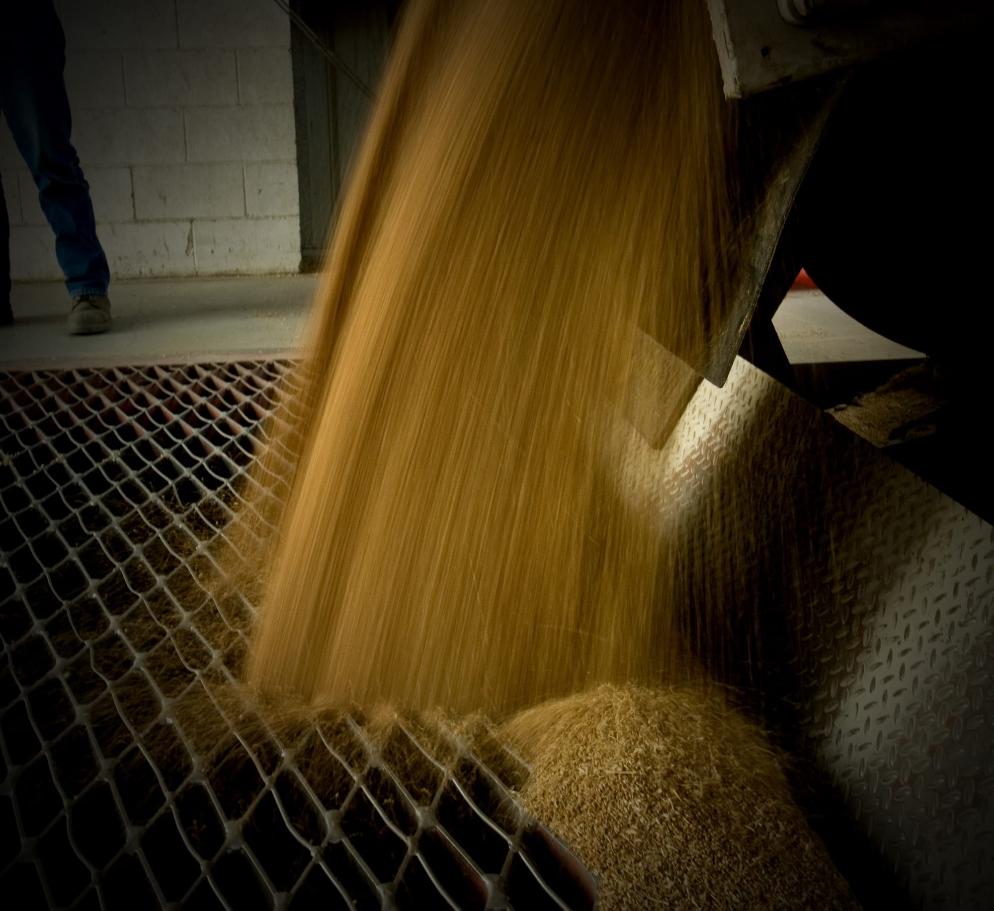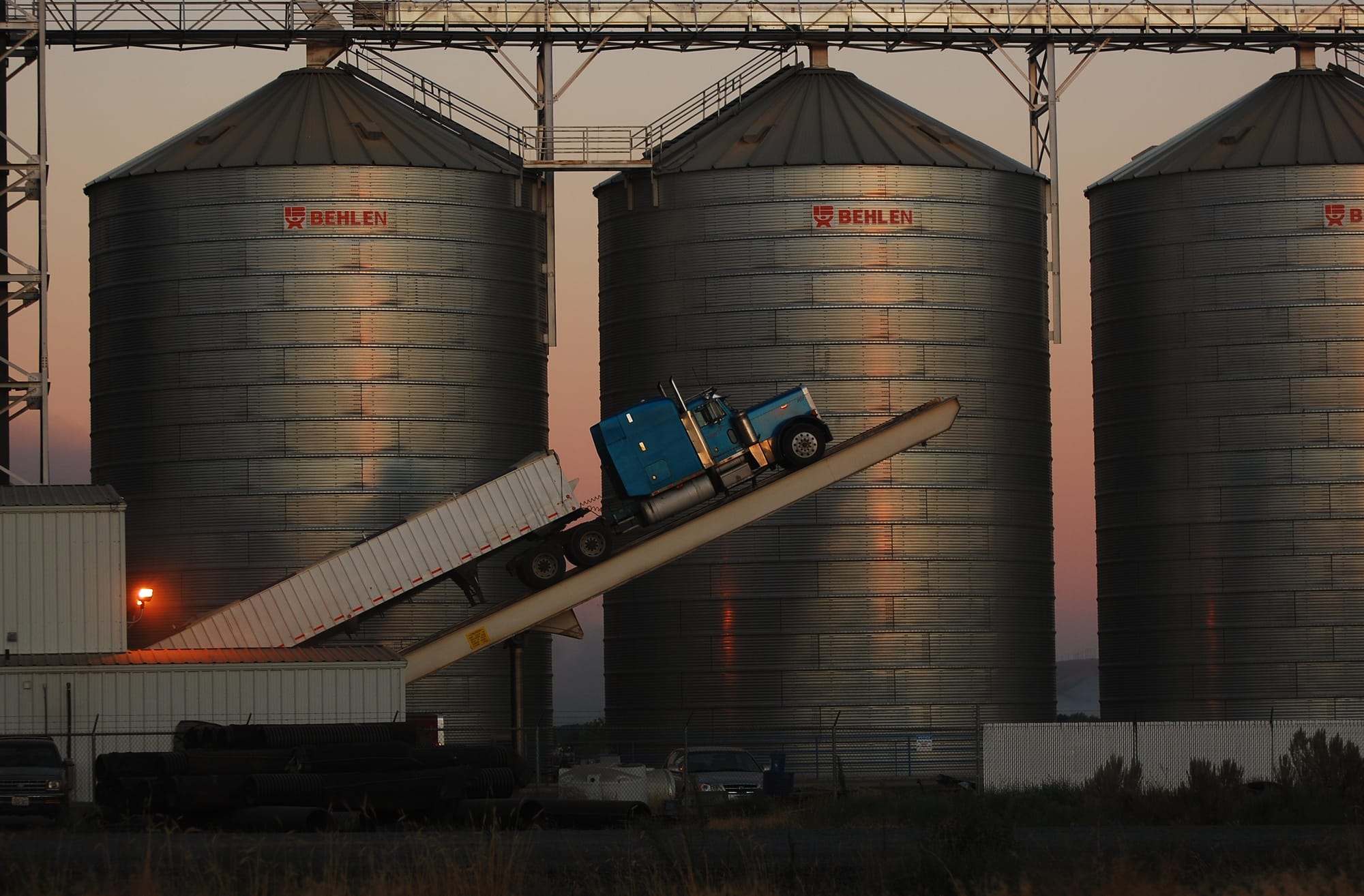 LEFT: Wheat is loaded for the long haul to the grain terminal. RIGHT: Grain is unloaded at Tri Cities Grain terminal. The wheat will be stored in tall storage silos, or in large outdoor piles, until it can be processed and sent to market.