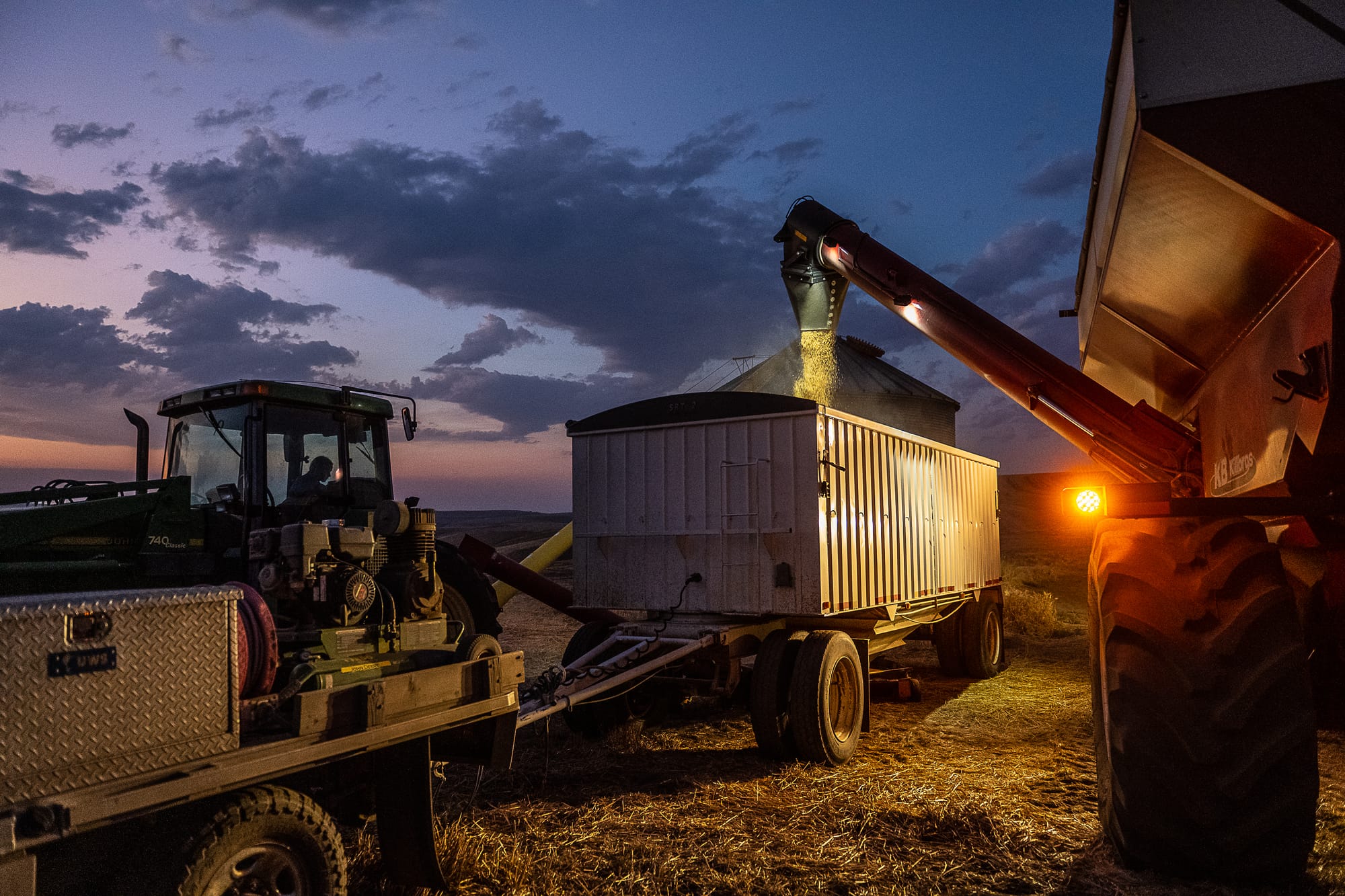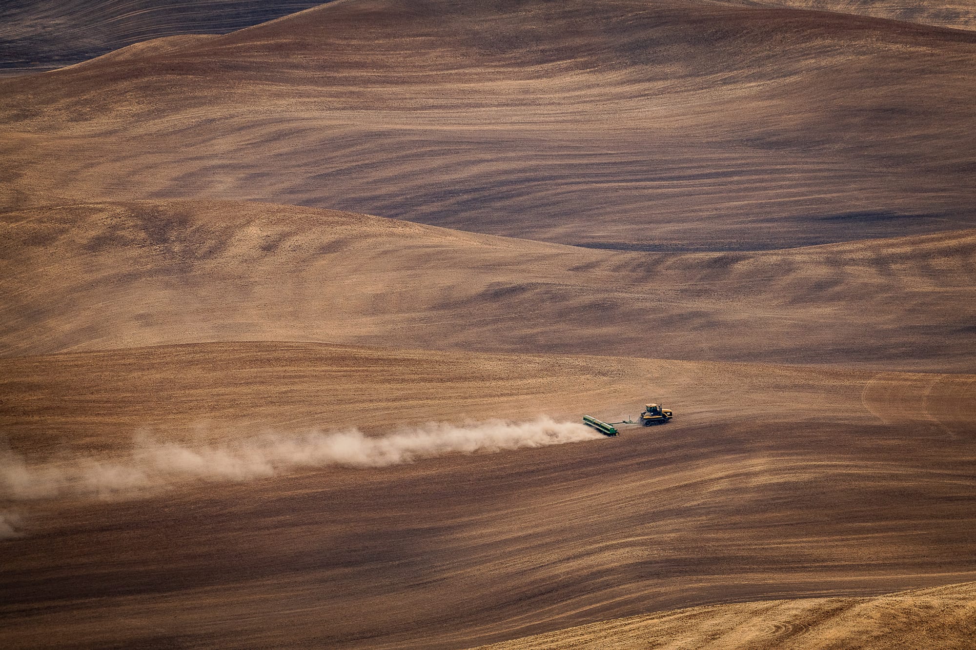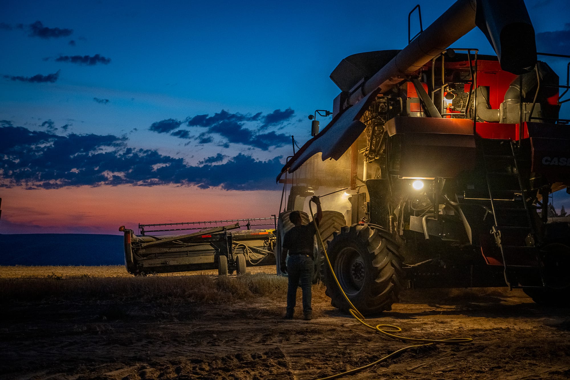 Tri-Cities Grain serves as a major collection and distribution hub for grain destined for both domestic and international markets. All through harvest season, as many as thirty trucks per hour unload the grain collected from around the Columbia Basin and surrounding areas.Some of the grain bound for overseas markets begins its journey down the Columbia River via barges. Here, a barge takes on a load at Tri-Cities Grain, near the confluence of the Snake River and Columbia River in Pasco.The Hastings family has been farming on several thousand acres perched above the Snake River since before Washington became a state in 1889. All of the kids help out from a very early age, and the harvest is carried out almost entirely with help from the family. FROM LEFT: Dick Hastings, Josh, Mike (holding Comet, the dog), Mindy, Justin, Nick, and Heather.Late season thunderstorms in July and August pose a threat to wheat farmers. Hail can damage the crop, making it hard to harvest, and lightning often starts fires in the dry wheat, which can destroy a whole season’s worth of work overnight.A farmer near Steptoe Butte north of Colfax, Washington plants the seeds for next year’s crop in September, hoping for enough moisture over the winter to bring the plants to germination.George Struthers continues to farm on land that has been worked by his family for over 100 years.The beauty of wide open spaces is one of the intangible rewards of farm life.