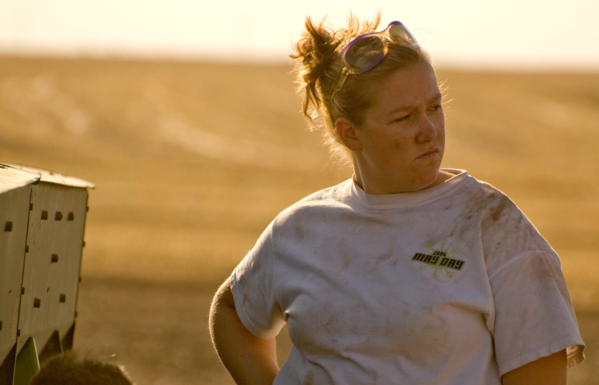 A combine is harvesting wheat. Modern combines have air conditioning and GPS, but the work is still dirty, dusty, and tedious. Tiffany Struthers helps with the harvest at the family farm off Highway 124, near the town of Prescott, Washington.