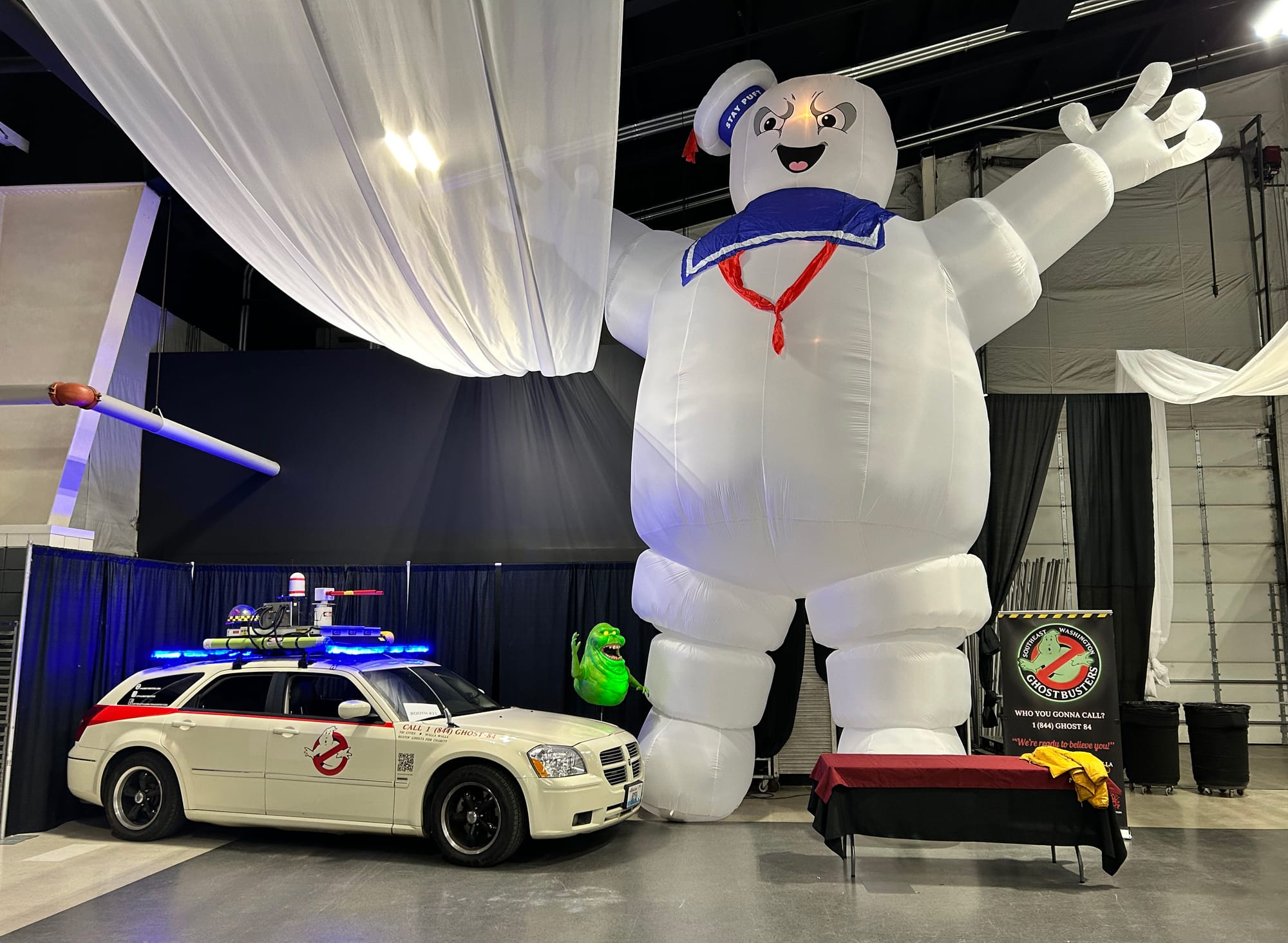 FROM LEFT TO RIGHT: My son Ian in his Ghostbusters outfit many years ago, which was the impetus to get this going. / Getting set up at Family Expo 25 with Ecto-1, Slimer, and Stay Puft Marshmallow Man (Marshall).